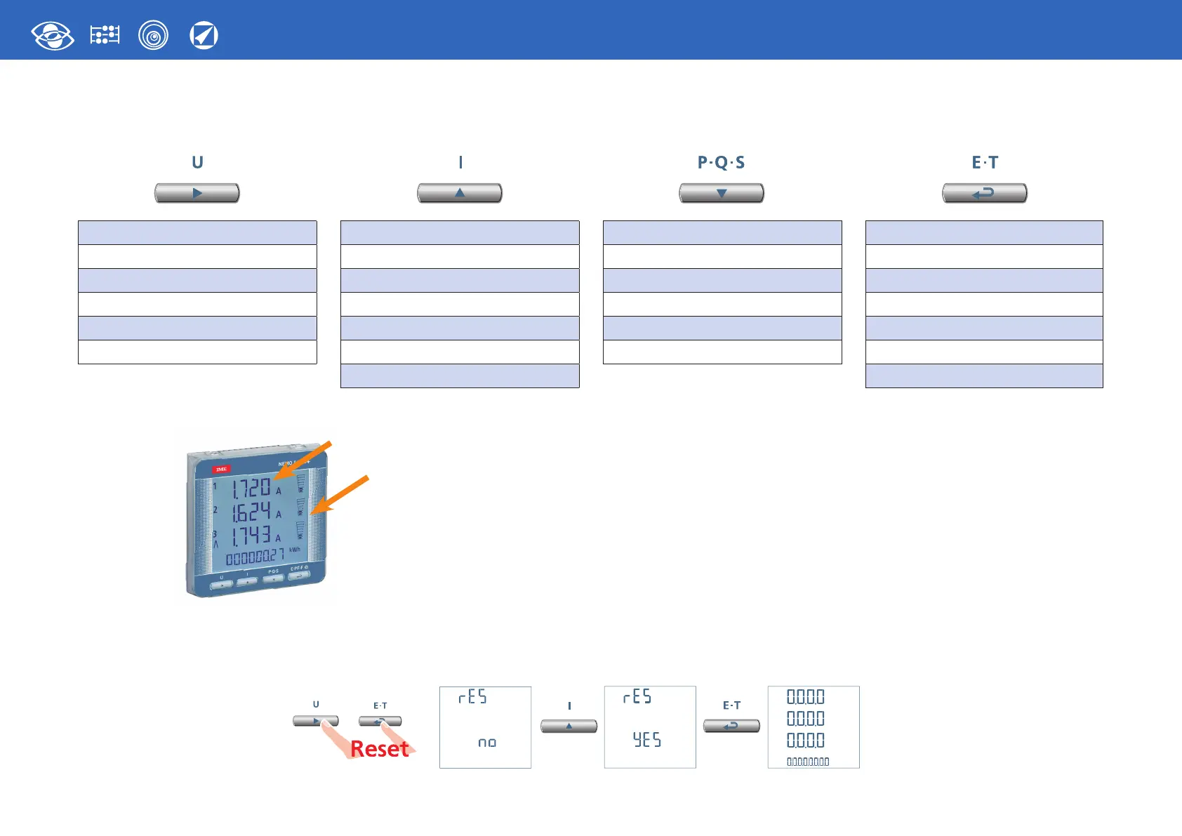 Display is divided into four menus, accessible with their relevant function keys. Acting on the function keys it is possible to scroll the different available measurements: