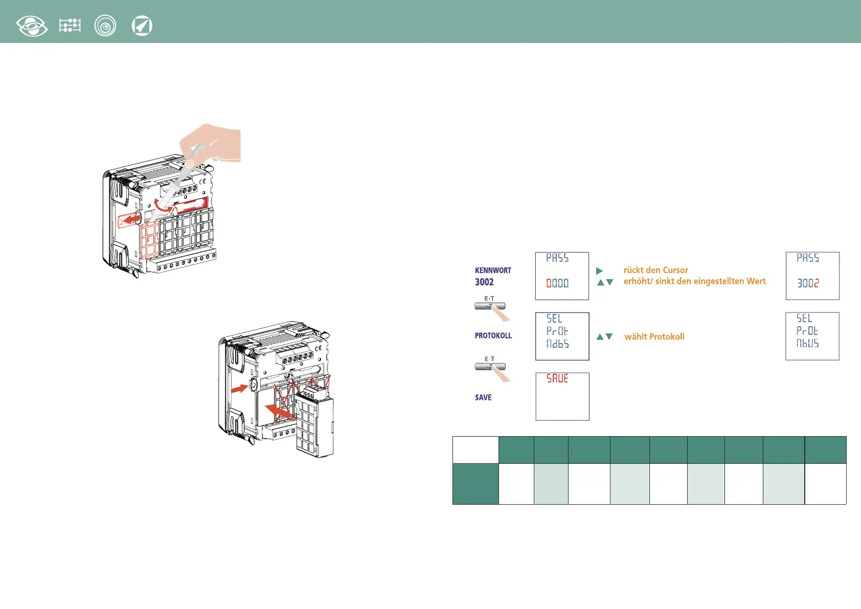 Stellen Kennwort 3002 ein und wählen das Kommunikationsprotokoll (siehe Tabelle).