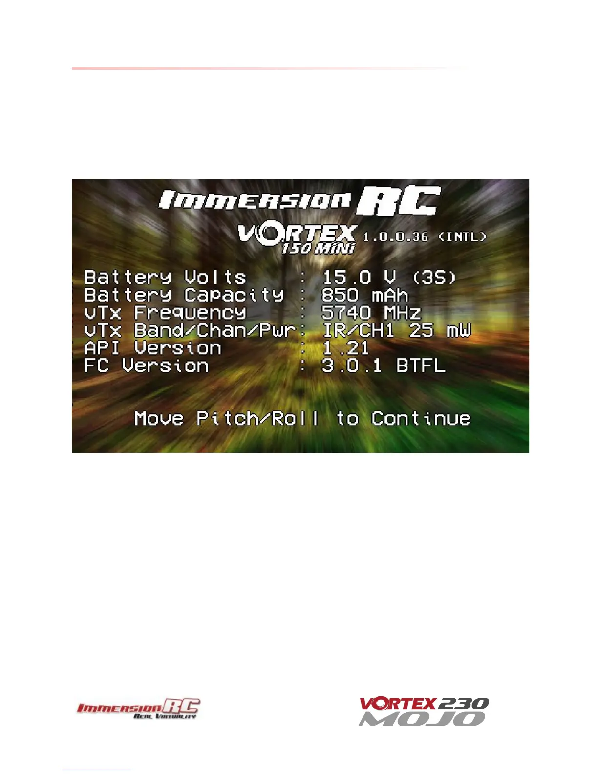 Each time the Vortex is powered up, and before sticks are moved, the following welcome screen is displayed.