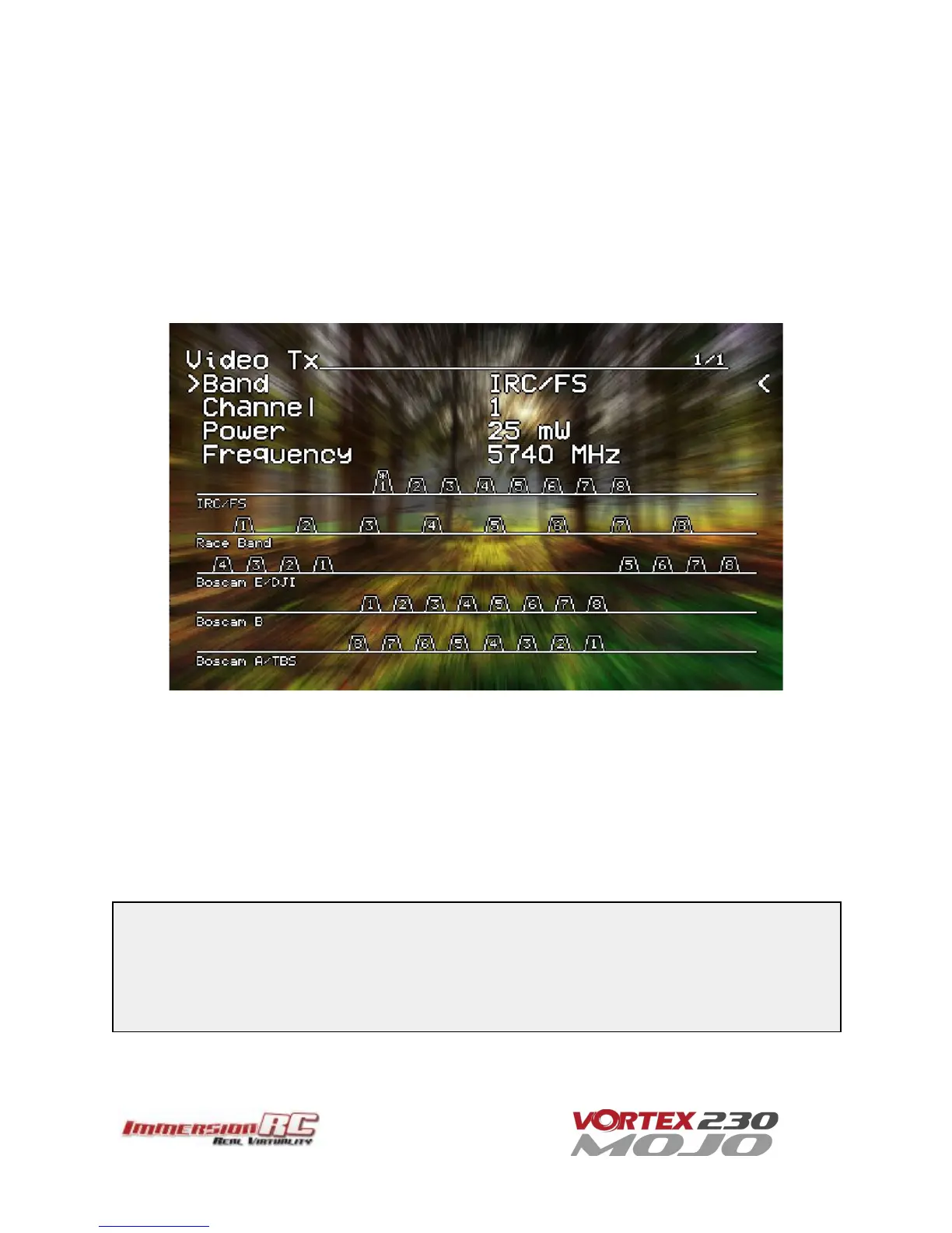 The Video Tx menu shows, graphically, the 5.8GHz frequency band, from low (left) through high (right)