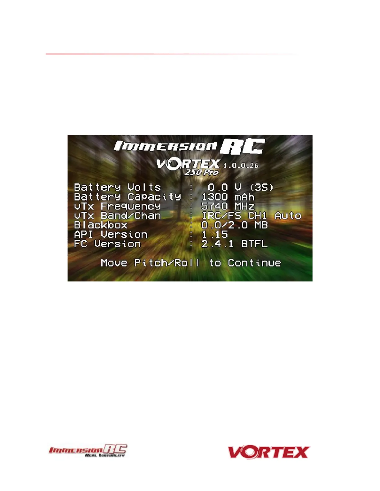 Each time the Vortex is powered up, and before sticks are moved, the following welcome