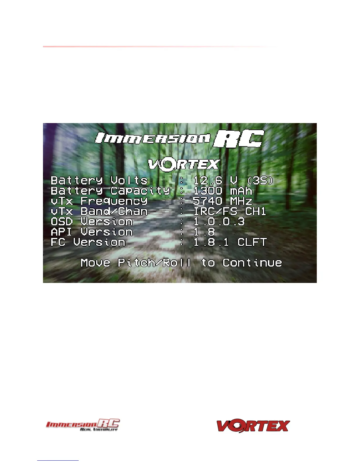 Each time the Vortex is powered up, and before sticks are moved, the following welcome