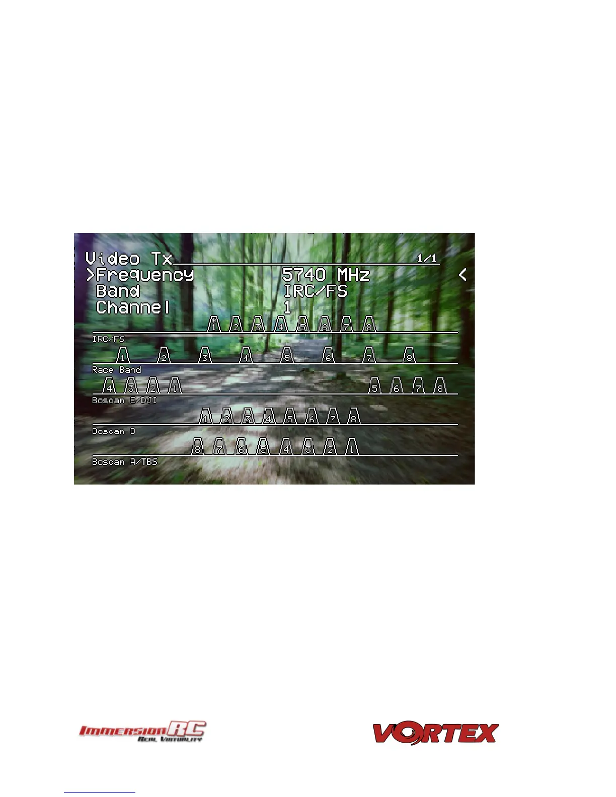 The Video Tx menu shows, graphically, the 5.8GHz frequency band, from low (left) through