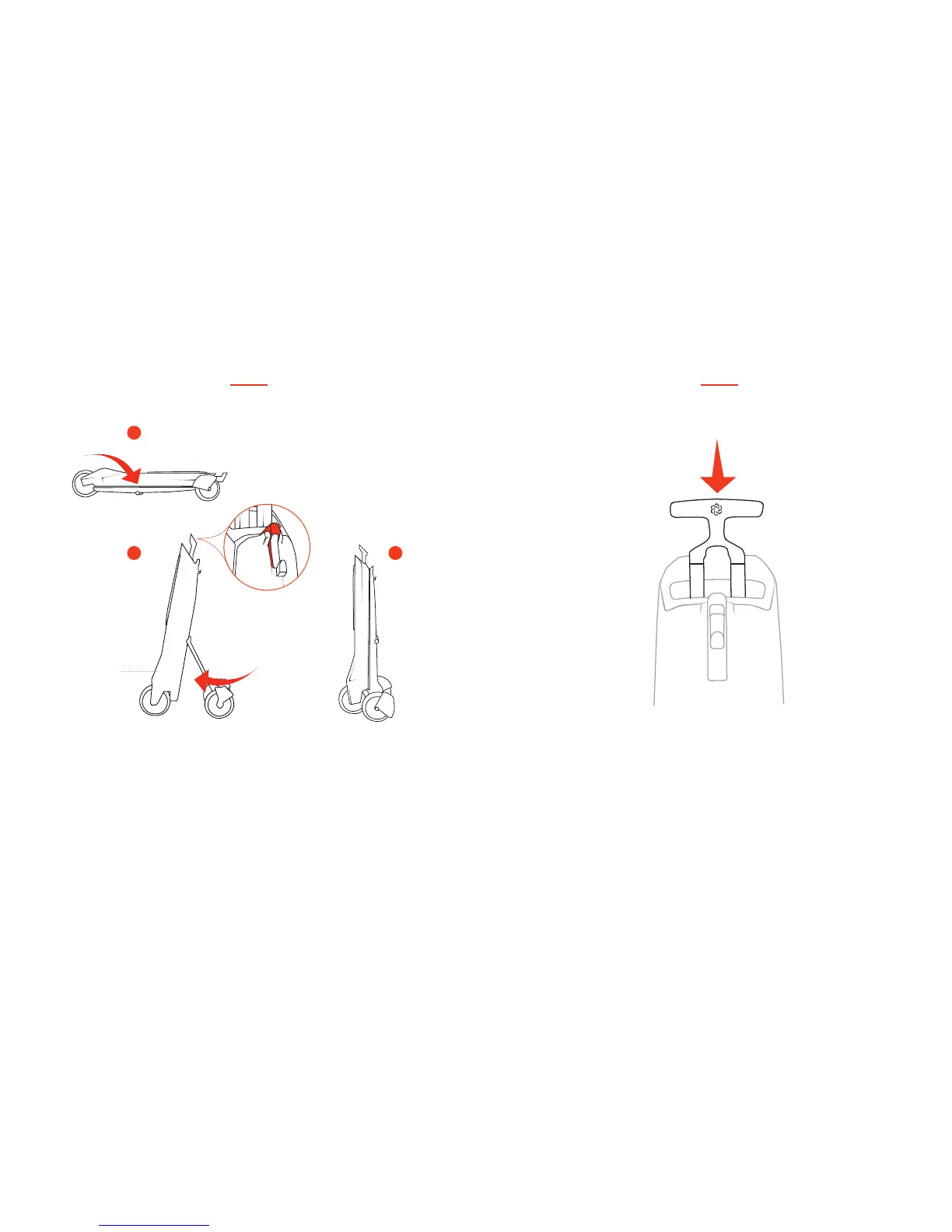 2&3) Lift the latch to release rear wheels and fold/lock the