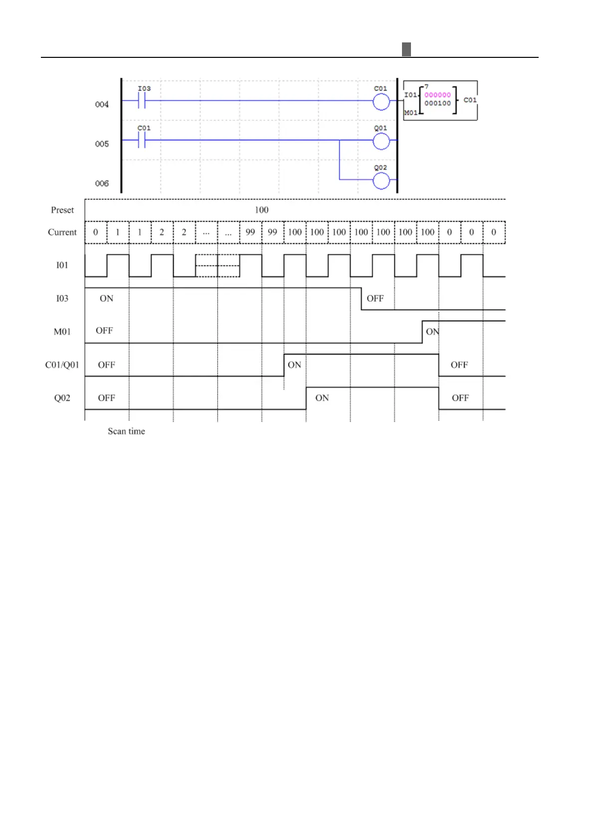 ExampleQ01 output ON with C01, and Q02 output ON with scan time.