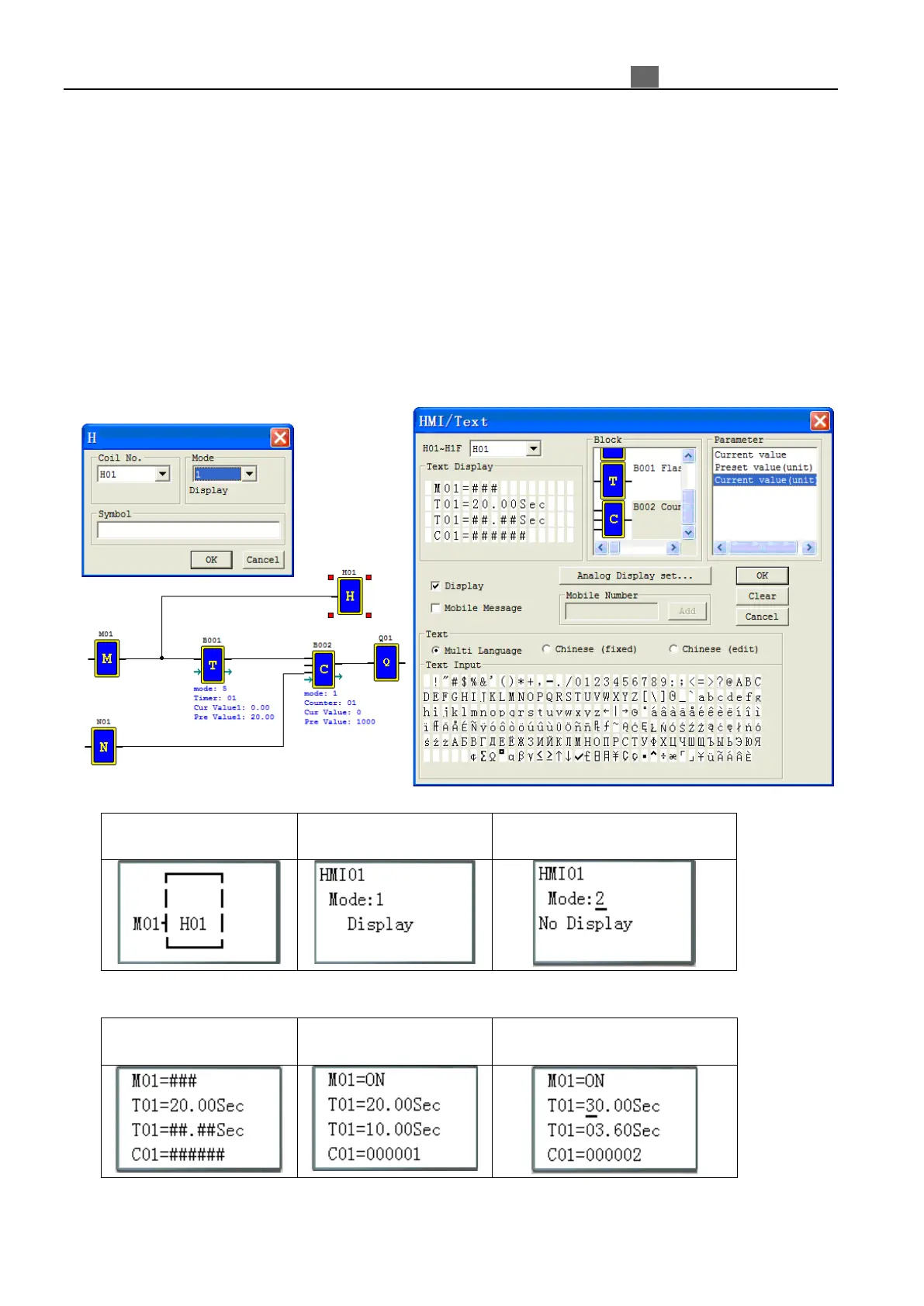 mple: H01 controlled by M01, and setting H01 mode1, display M01 status, preset value and current value for