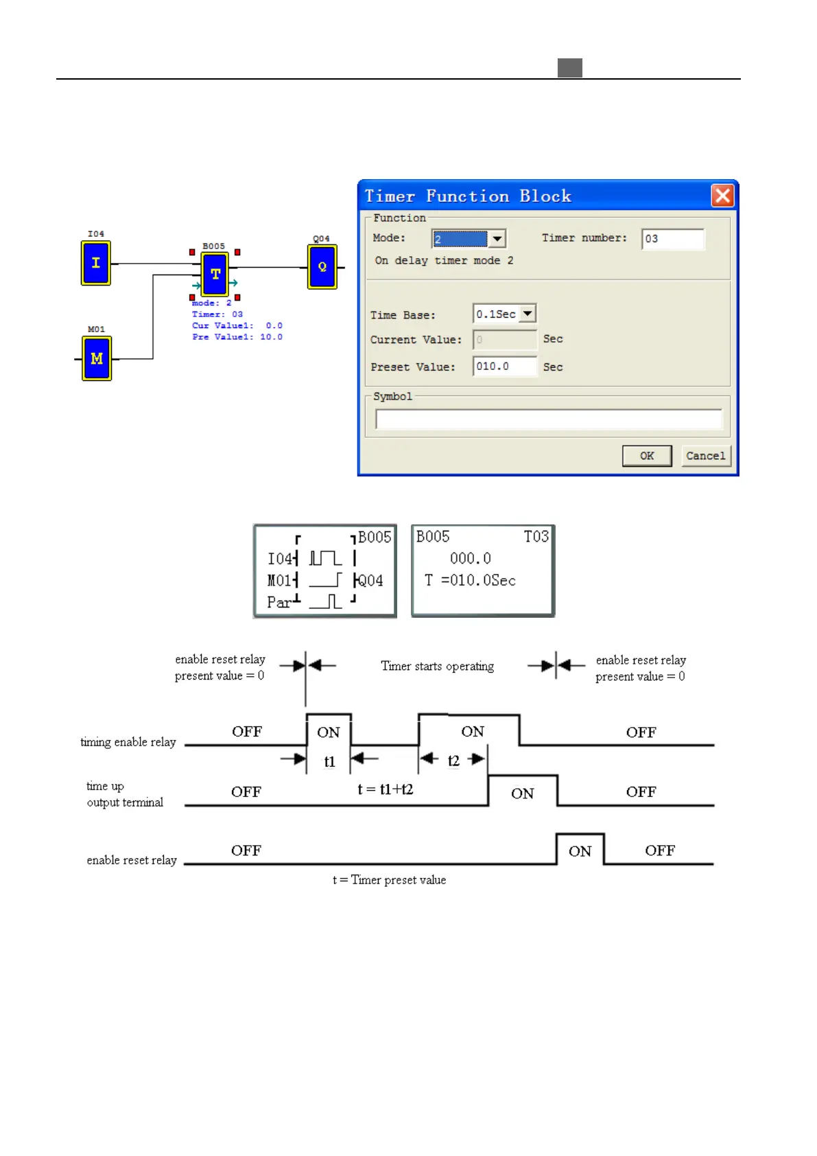 Mode 2 Timer is an ON-Delay with reset that will time up to a fixed preset value and stop timing when the current