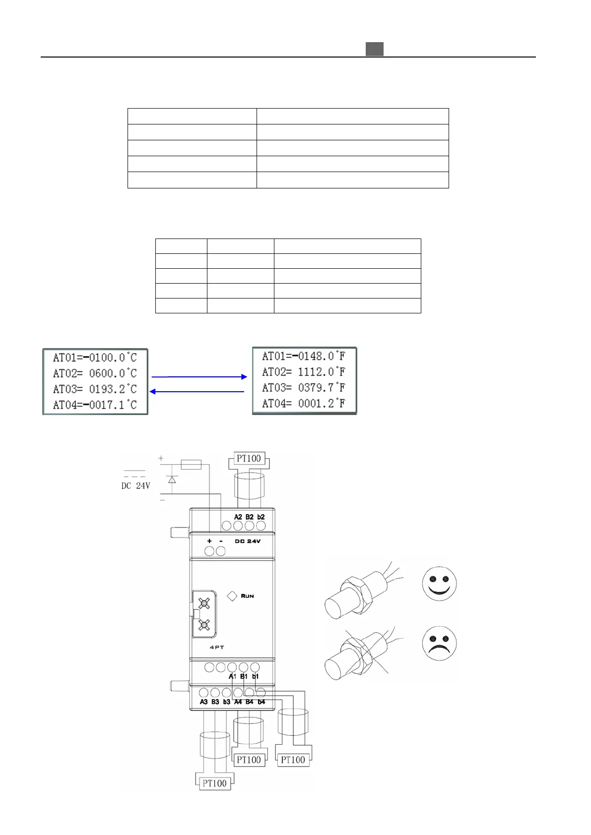 The 4 channel 12bits temperature (PT100) analog input module, 4PT, has the corresponding registers with