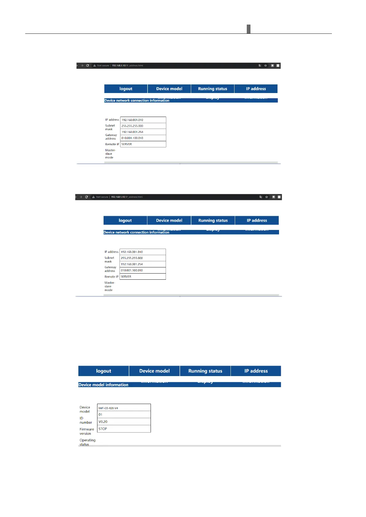 SMTIP address, Subnet mask, Gateway, Remote master IP and master/slave mode: