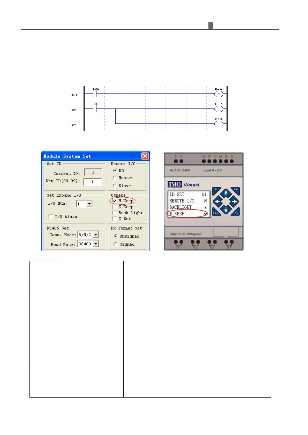 The state of auxiliary relays “M01~M3F” will be kept when the smart powers down if “M Keep” is active. “
