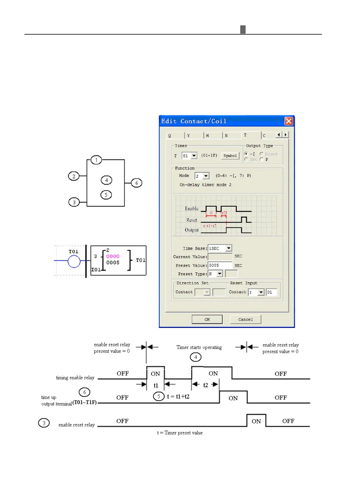 be ON when the current value is 5. The timer reset input is input I01. The timer current value will reset to 0, and