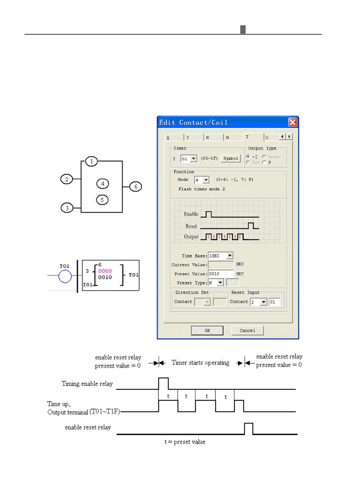 timer reset input is Input I01. Timer status bit T01will be ON immediately when its rung is true and begin its timing