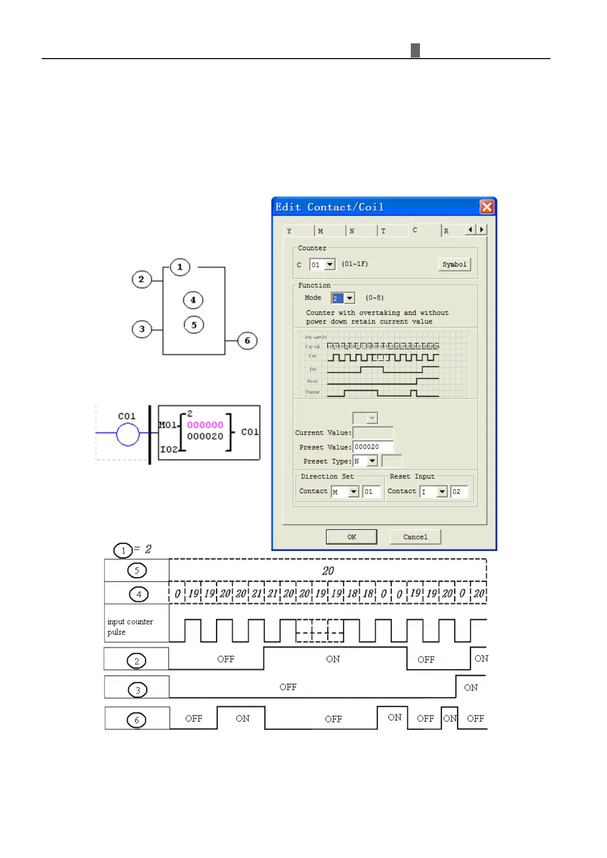 counter will continuously count when reach its preset value of 20. Counter status bit C01 will be ON when the current value
