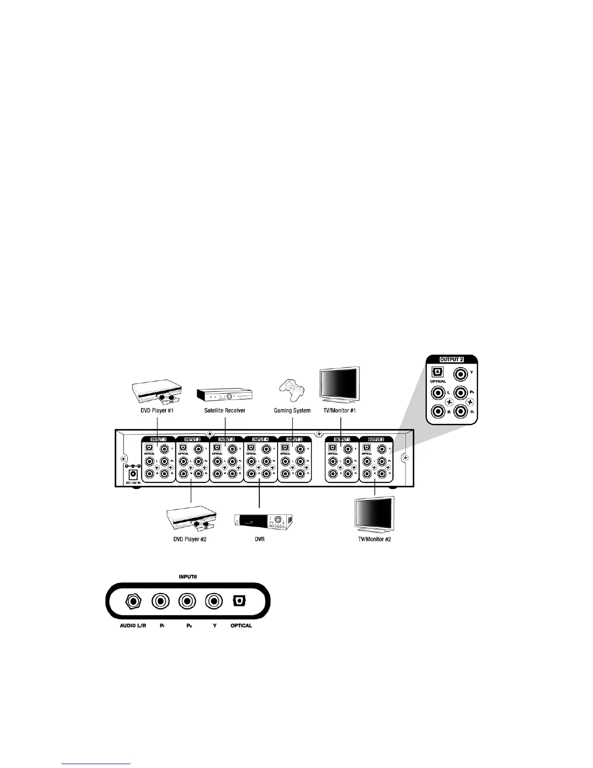 on the back of the switch or Input (6) Y, Pb, and Pr jacks on the front of switch.