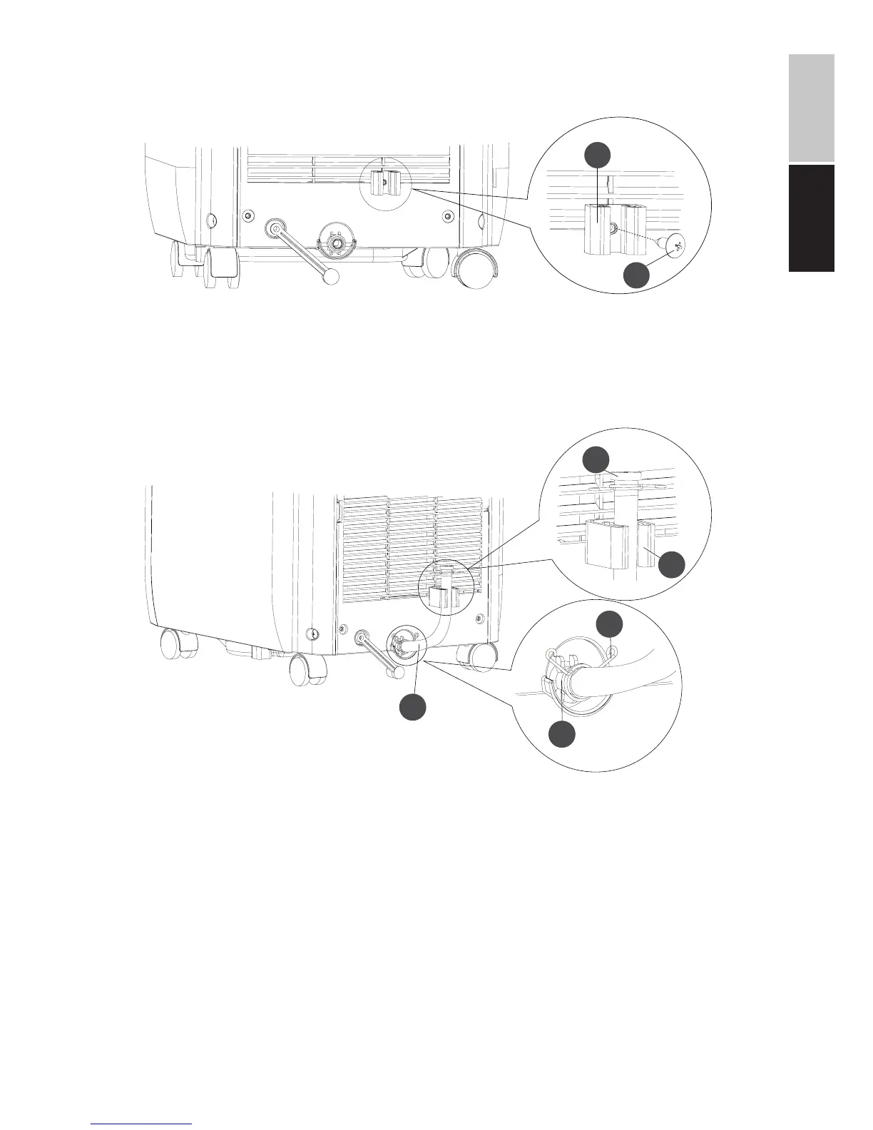 Paso 3: Coloque la tubería de drenado (#1) en el puerto de drenado (#2) y asegure con la