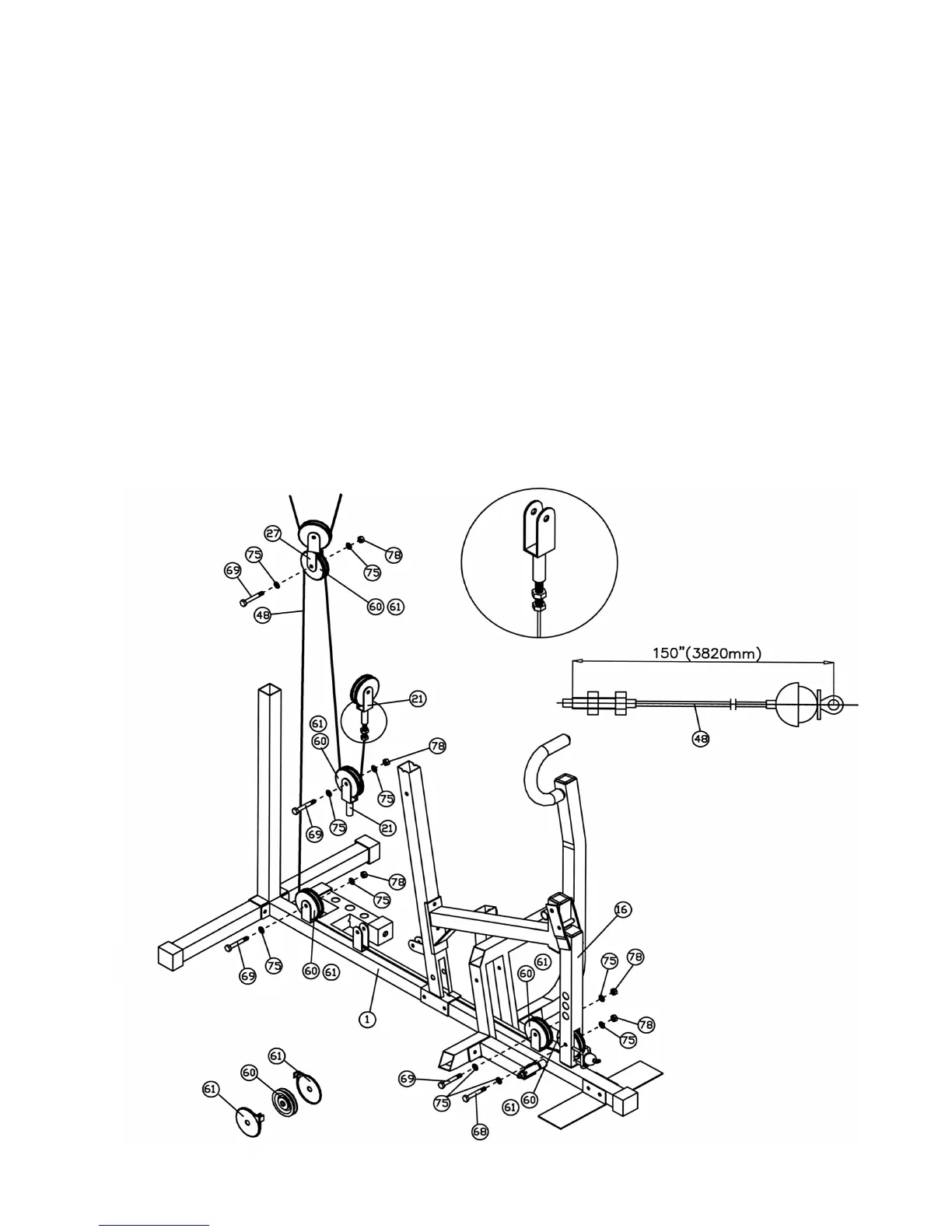 A.) Attach the 150” Cable (#48) to the Leg Developer (#16). Attach a Pulley (#60)