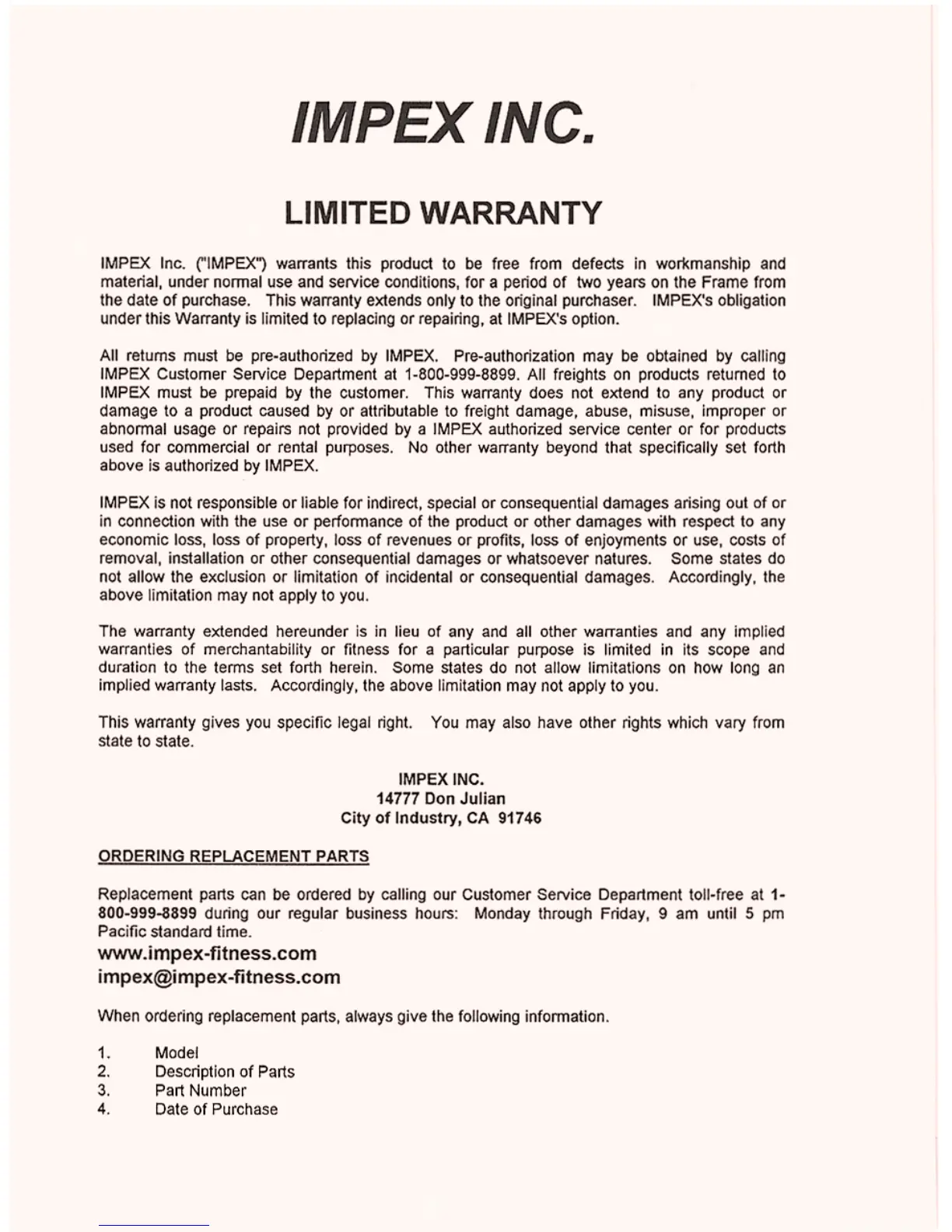 Impex CB 420 - Limited Warranty; Ordering Replacement Parts