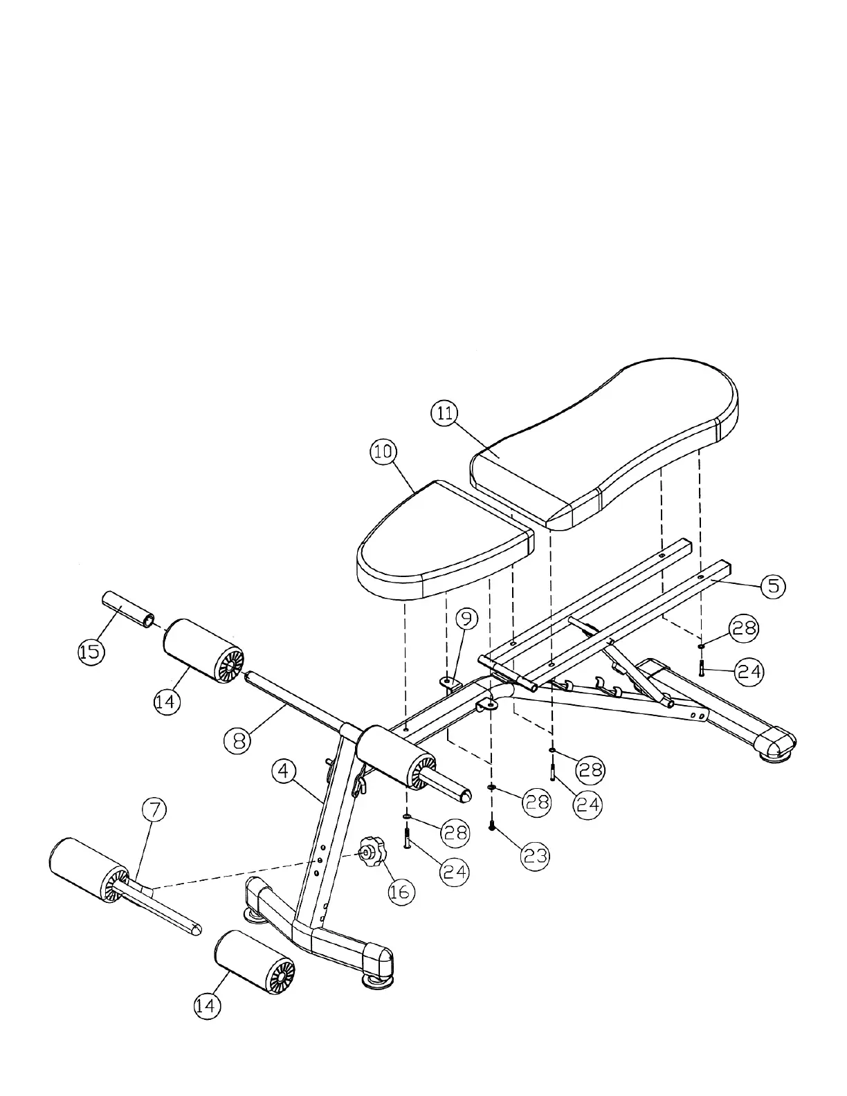 with two M8 x 5/8” Allen Bolts (#23) and Ø 5/8” Washers (#28). Secure the Seat to the Main