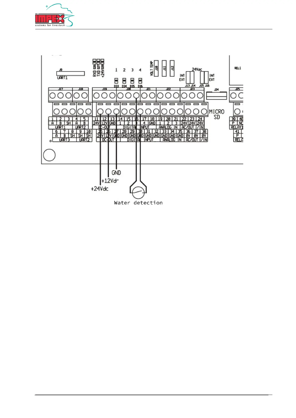 Note: The 12V or 24V power supply with a maximum of 50 mA can also be used to power a water detection sensor.