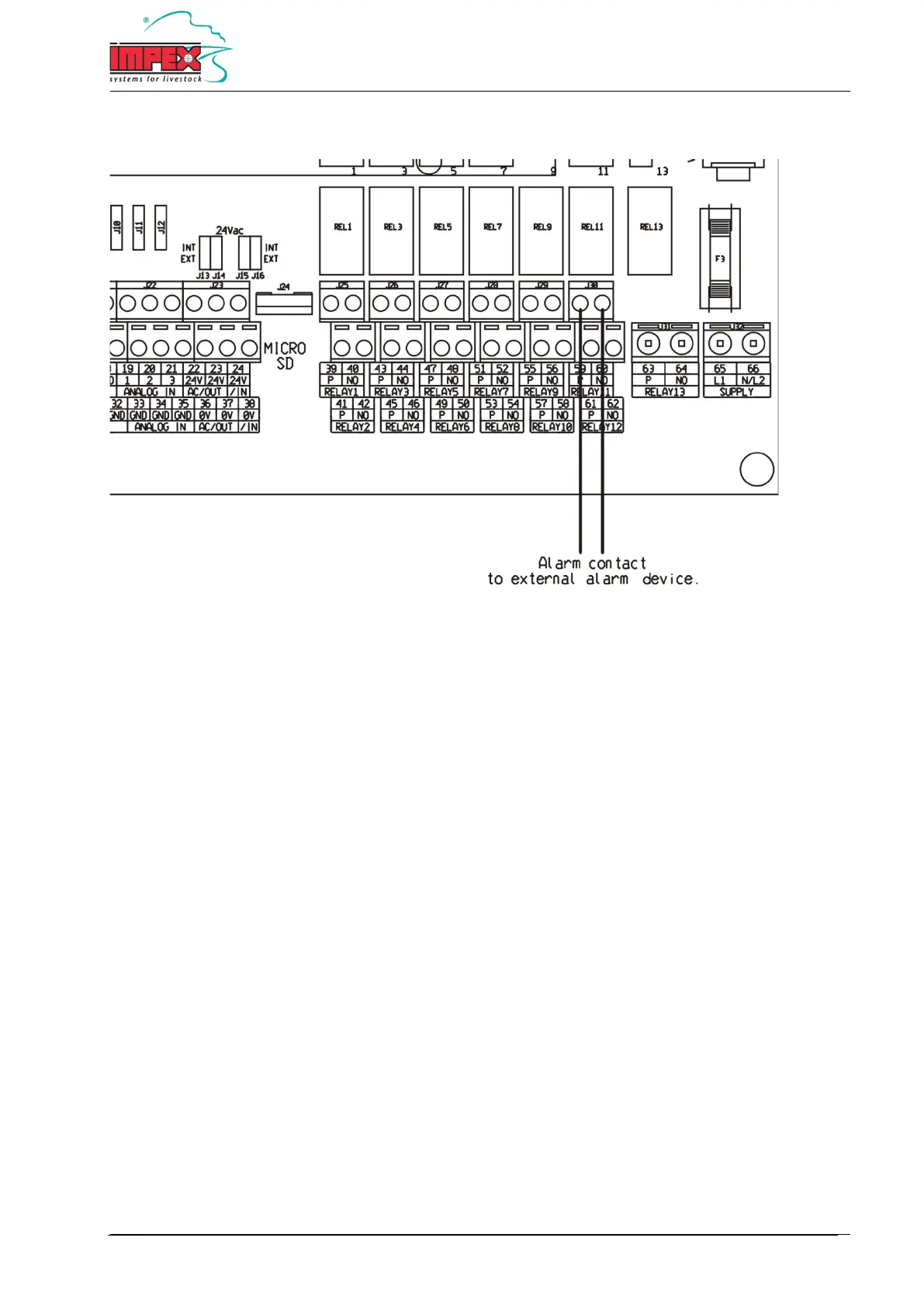 Note: Contacts 59 + 60 are closed when there is no alarm (relay is active). When there is an alarm, contacts 59 + 60