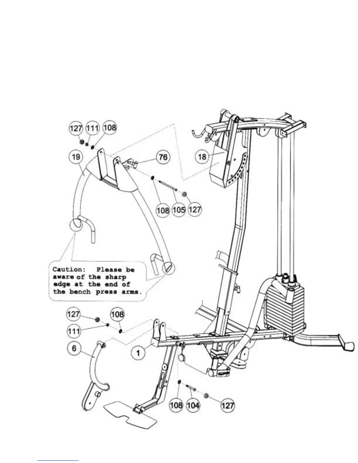 Bolt and Nut with two Cover Caps (#127). Use the Front Press Lock Pin (#76) on the Front Press to