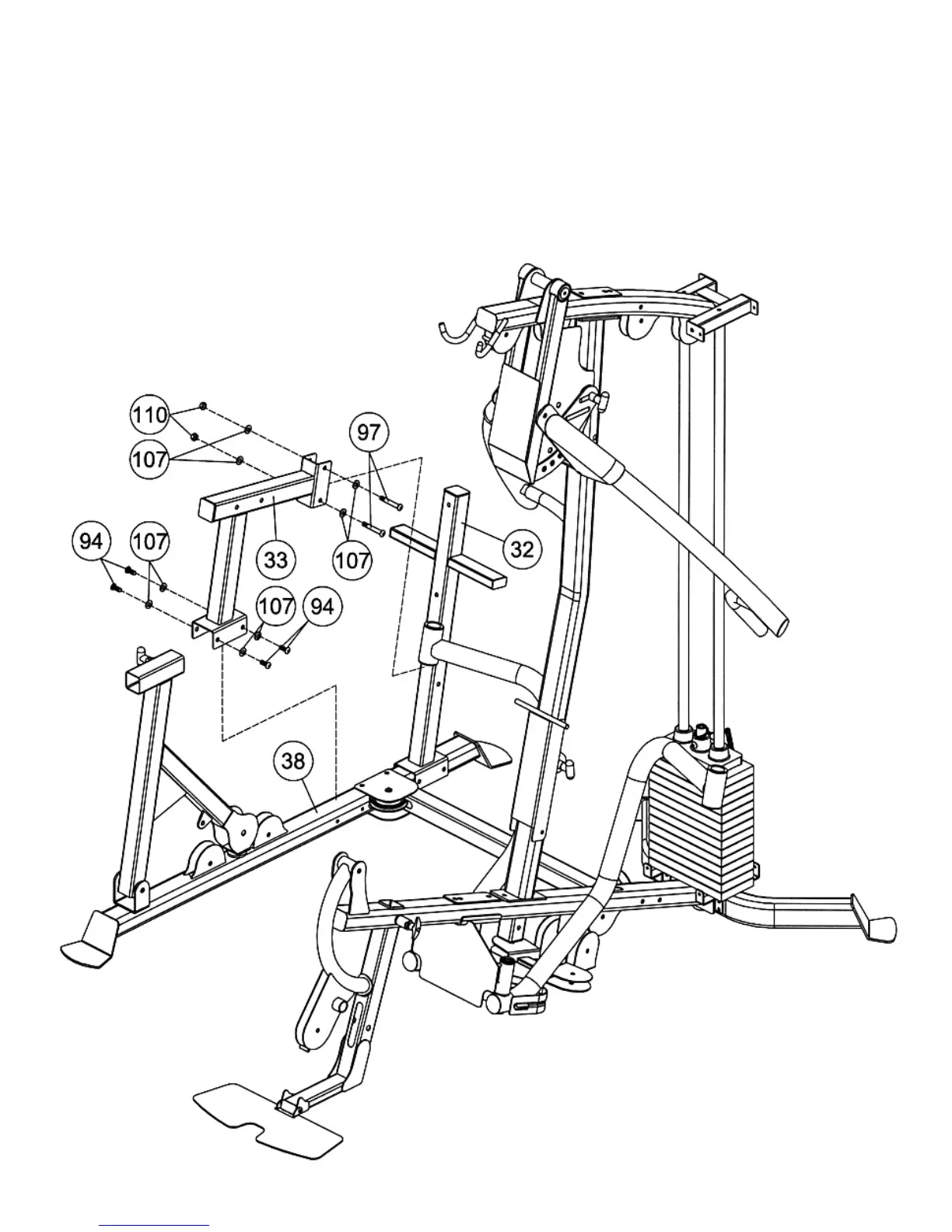 A.) Attach the Leg Press Seat Support (#33) to the Leg Press Base Frame (#38). Secure it with four