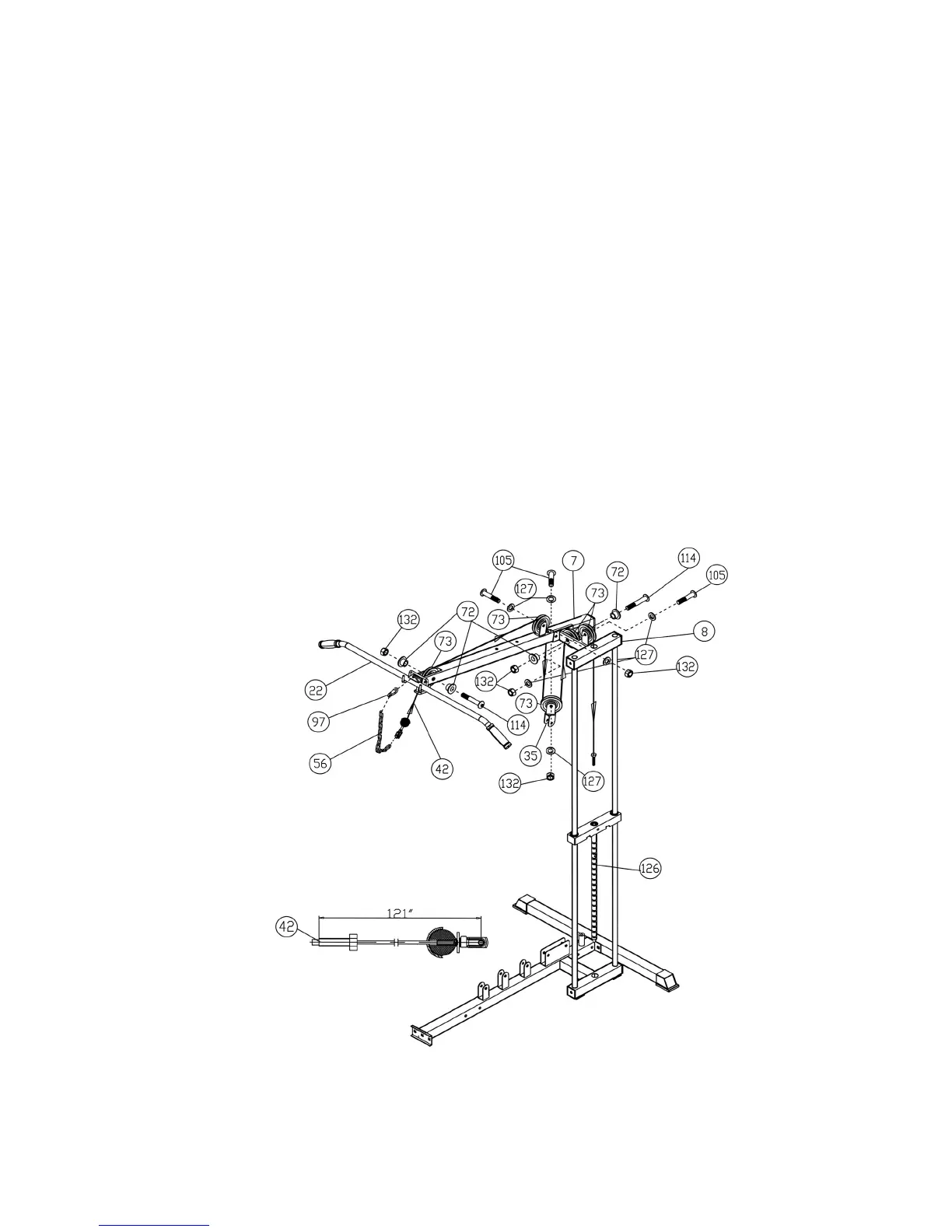 A.) Attach the 121” Upper Cable (#42) to the front of the Upper Frame (#7). Install a Pulley (#73).