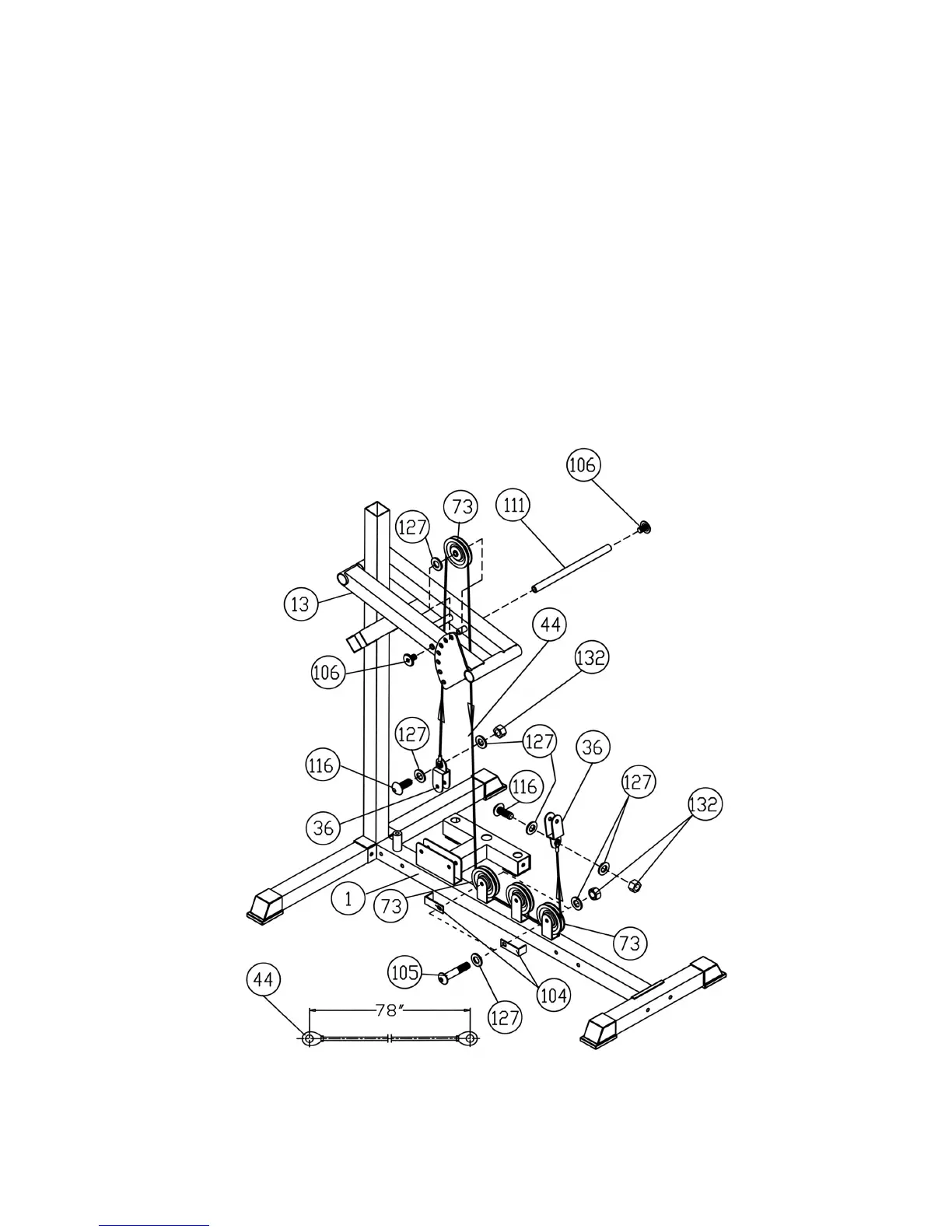 A.) Attach one end of the 78” Bench Press Cable (#44) to the Single Floating Pulley Bracket (#36)