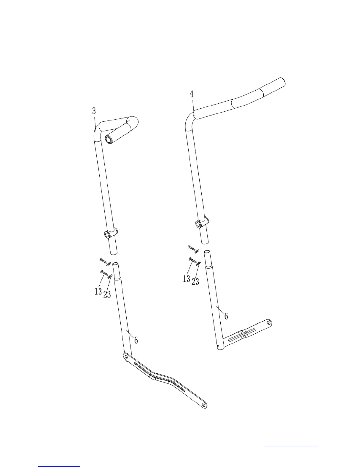 B.) Secure each set of Handlebar with two M6 x ½” Allen Bolts (#13) and two Ø ½” x Ø ¼” Curved