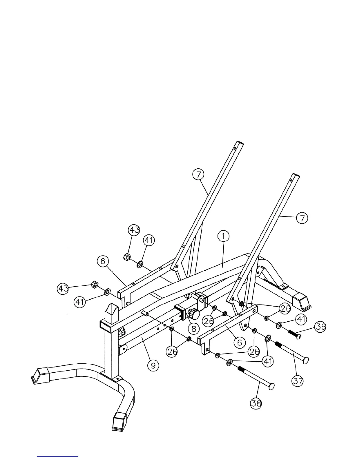 Backrest Supports (#7). Align the holes and secure them with one M10 x 6 ¾” Allen Bolt (#37),