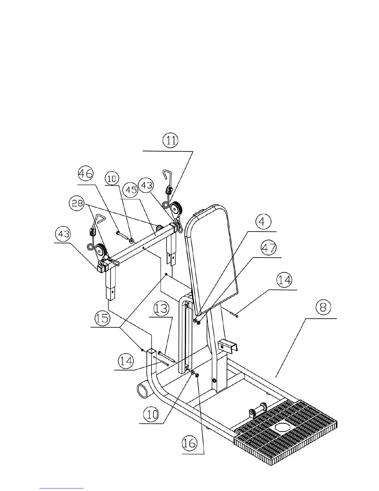 C.) Attach the Lower Pulley Support Base (#45) to the Rear Support Frame (#2). Secure it