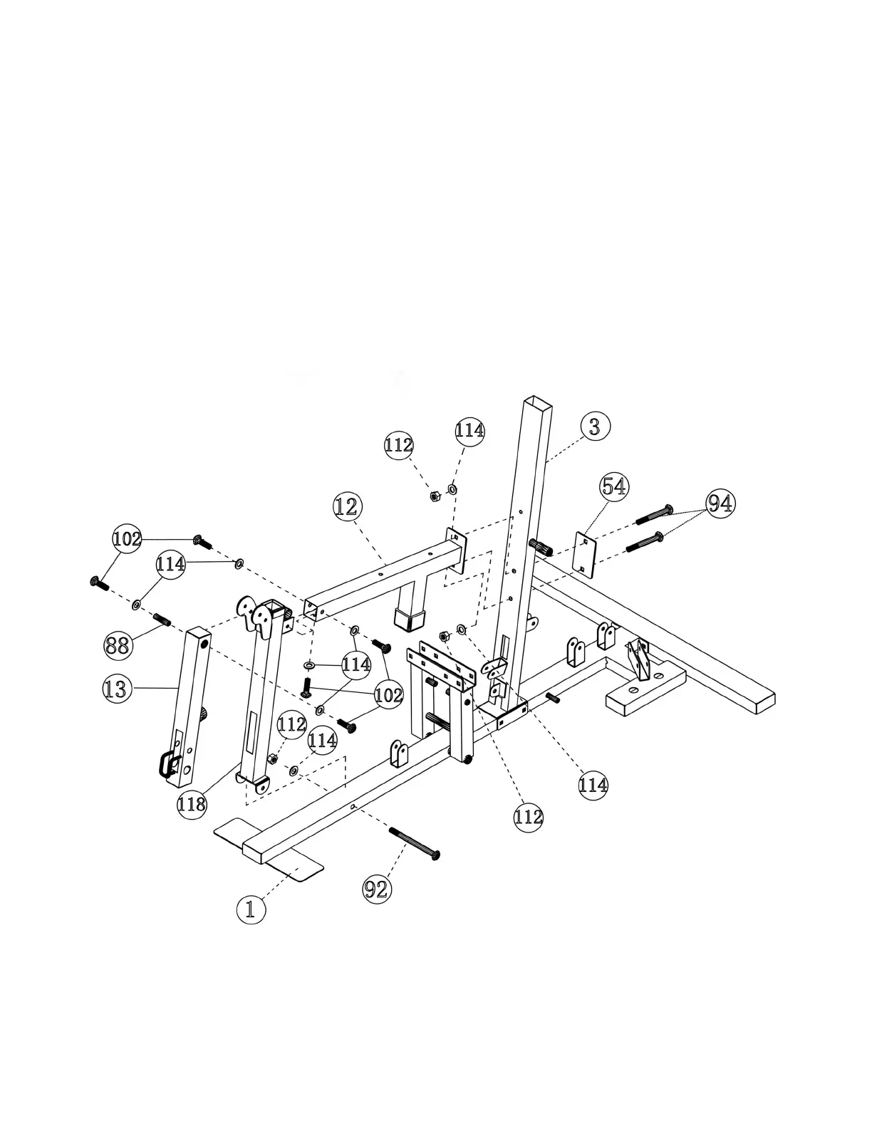 B.) Attach the Leg Developer Holder (#118) to the Base Frame (#1). Secure it with a M10 x 3 ¾”