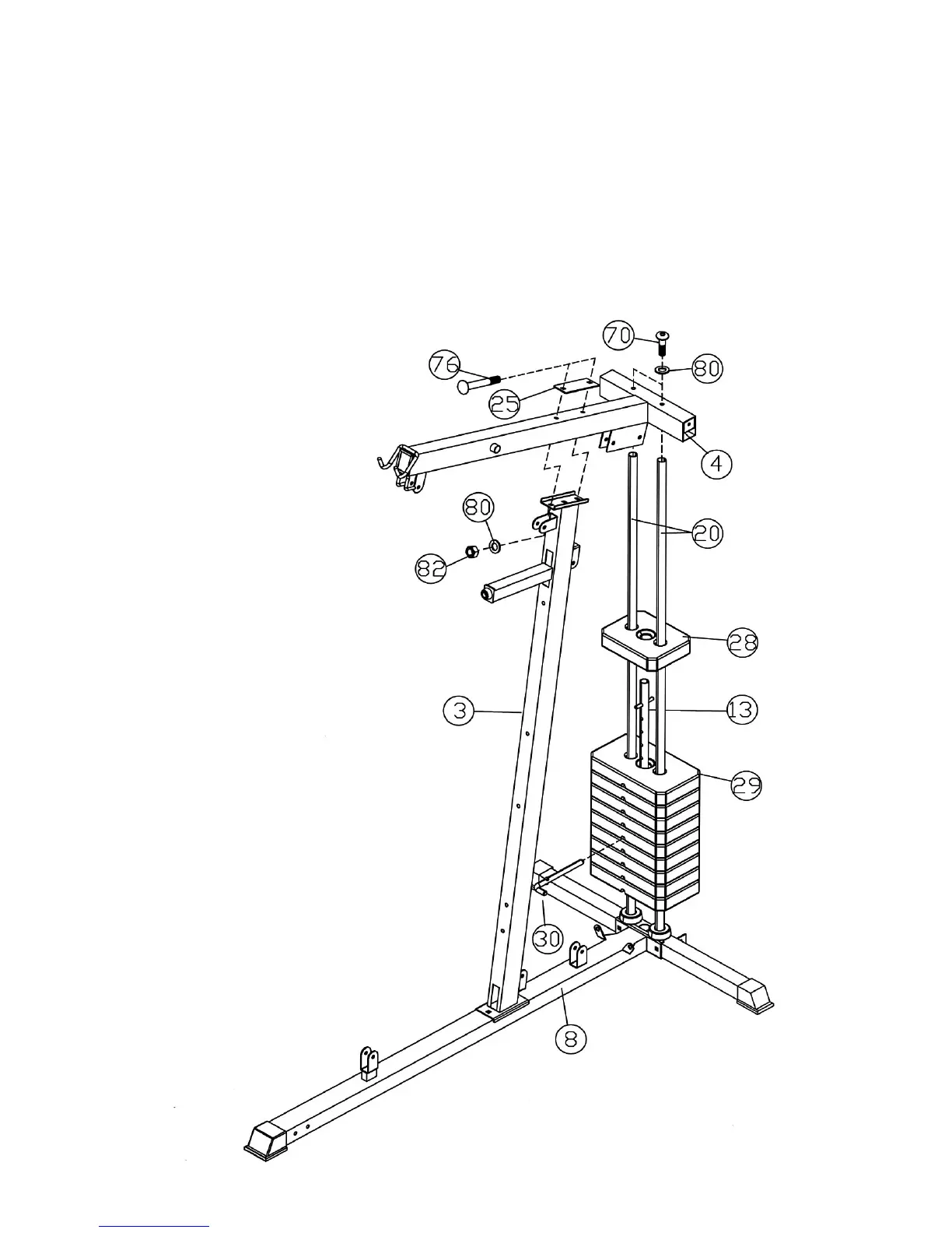 A.) Slide the 9 Weight Plates (#29) onto the Guide Rods (#20). Align the holes of the Weight