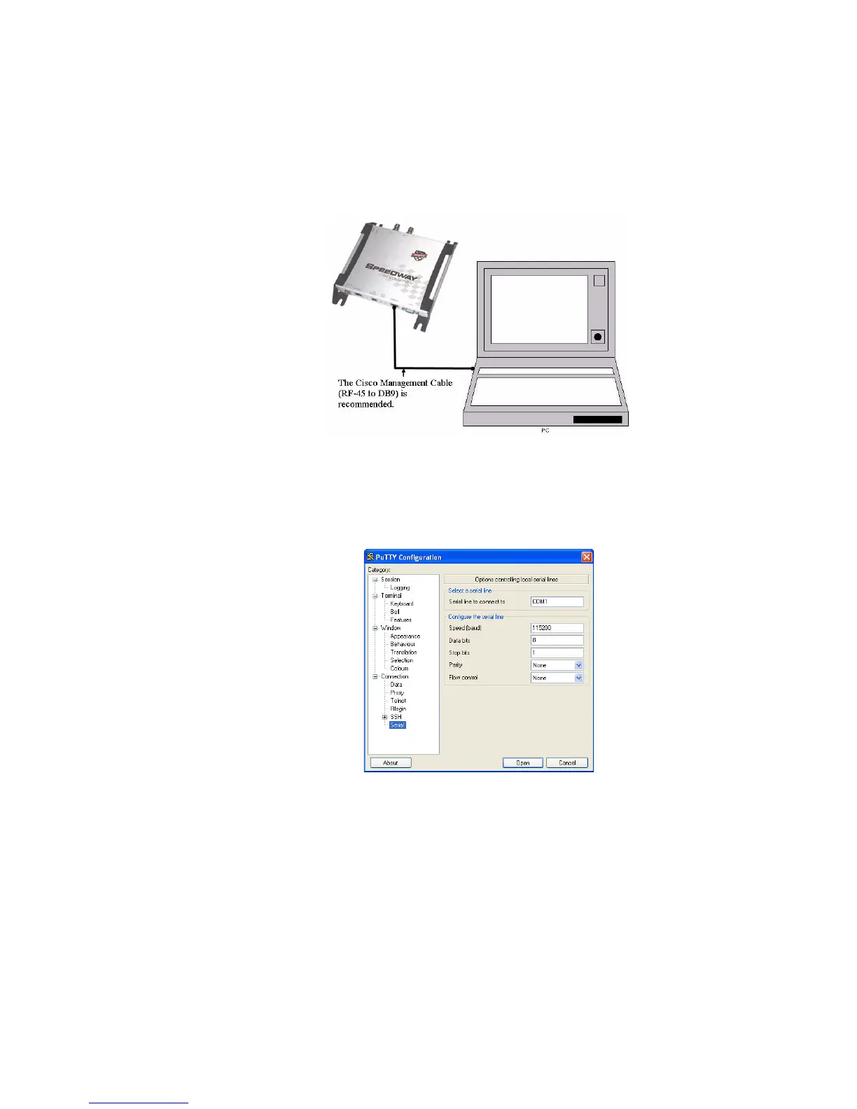 4. On the PC, run the Putty application and select the Serial connection option. Verify