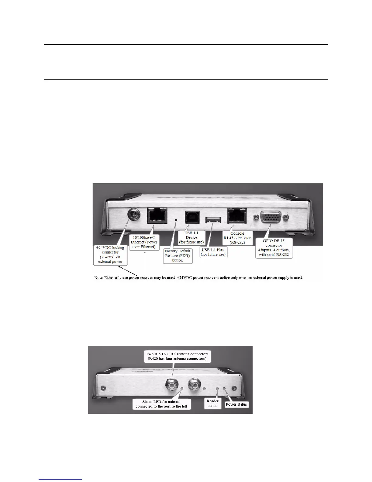 On the back side of the reader are the antenna ports and LED status indicators. The follow-