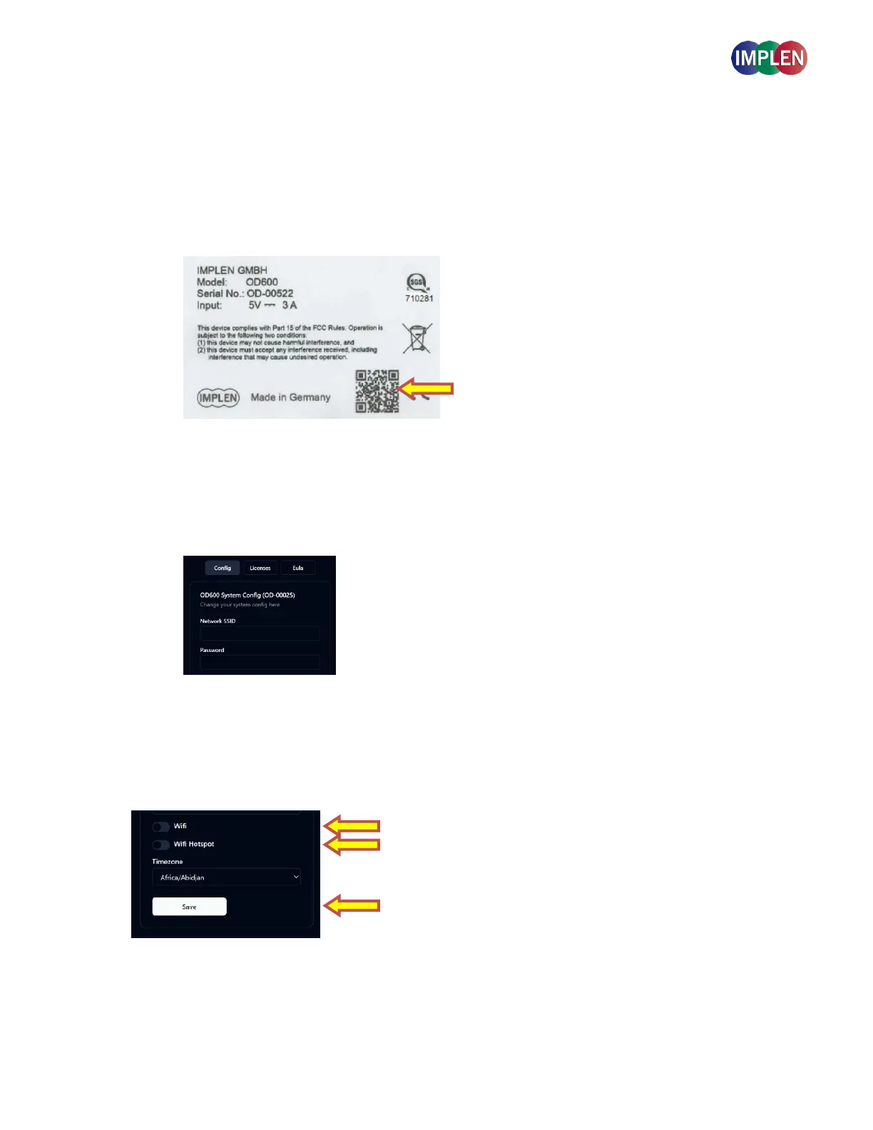 Network SSID (WI-FI Name) and password of the desired Wi-Fi network to connect the Implen OD600® to it.