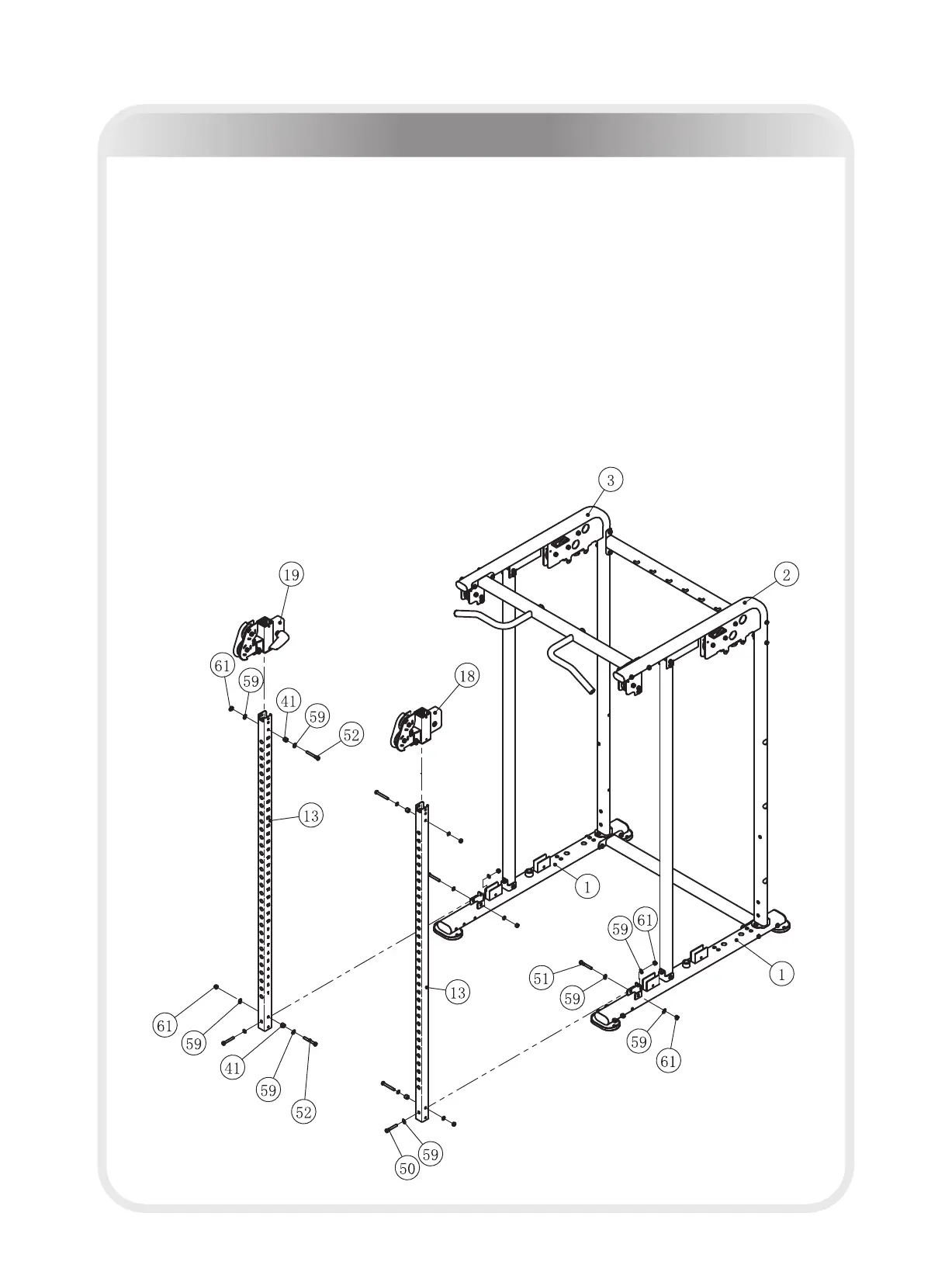 1. Attach the Right Pulley Frame ASSY (#18), the Left Pulley Frame ASSY (#19) to two