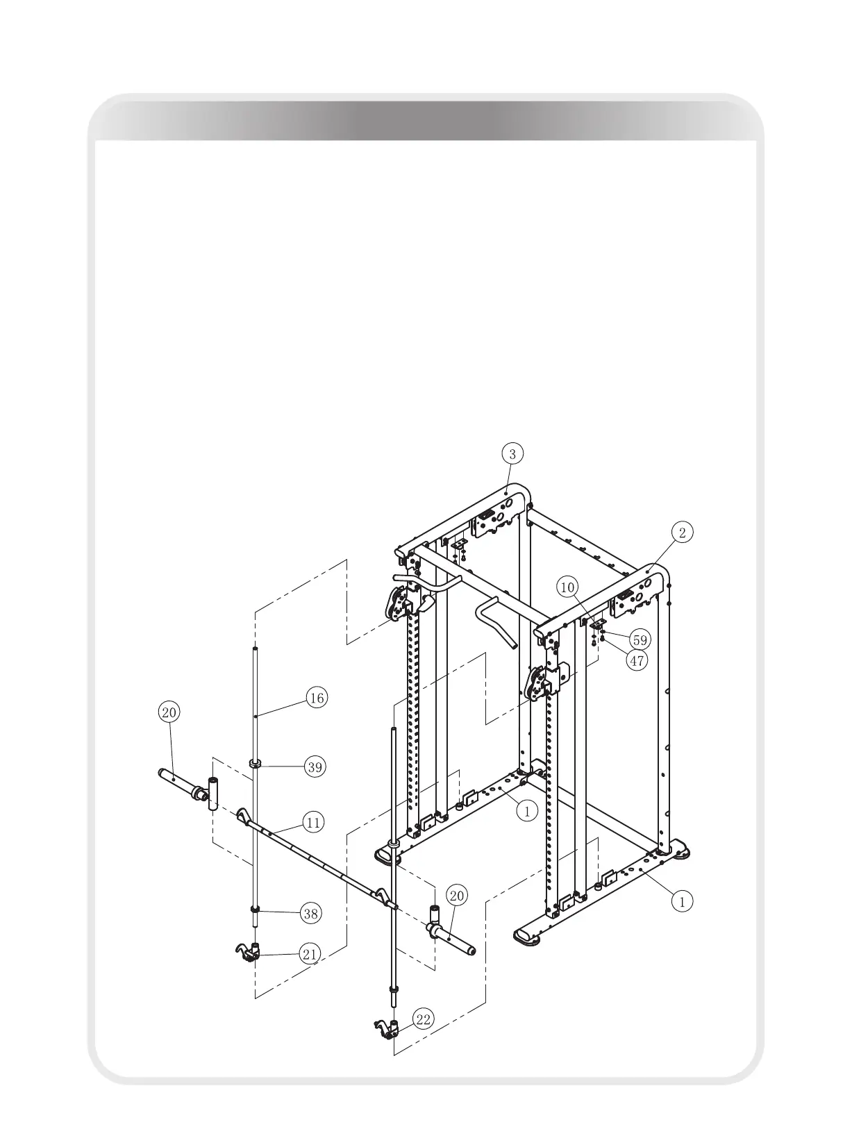 2. Attach two Sliding Barbell Frame ASSY (#20), two Φ65*Φ35*20 Cushion (#39), two