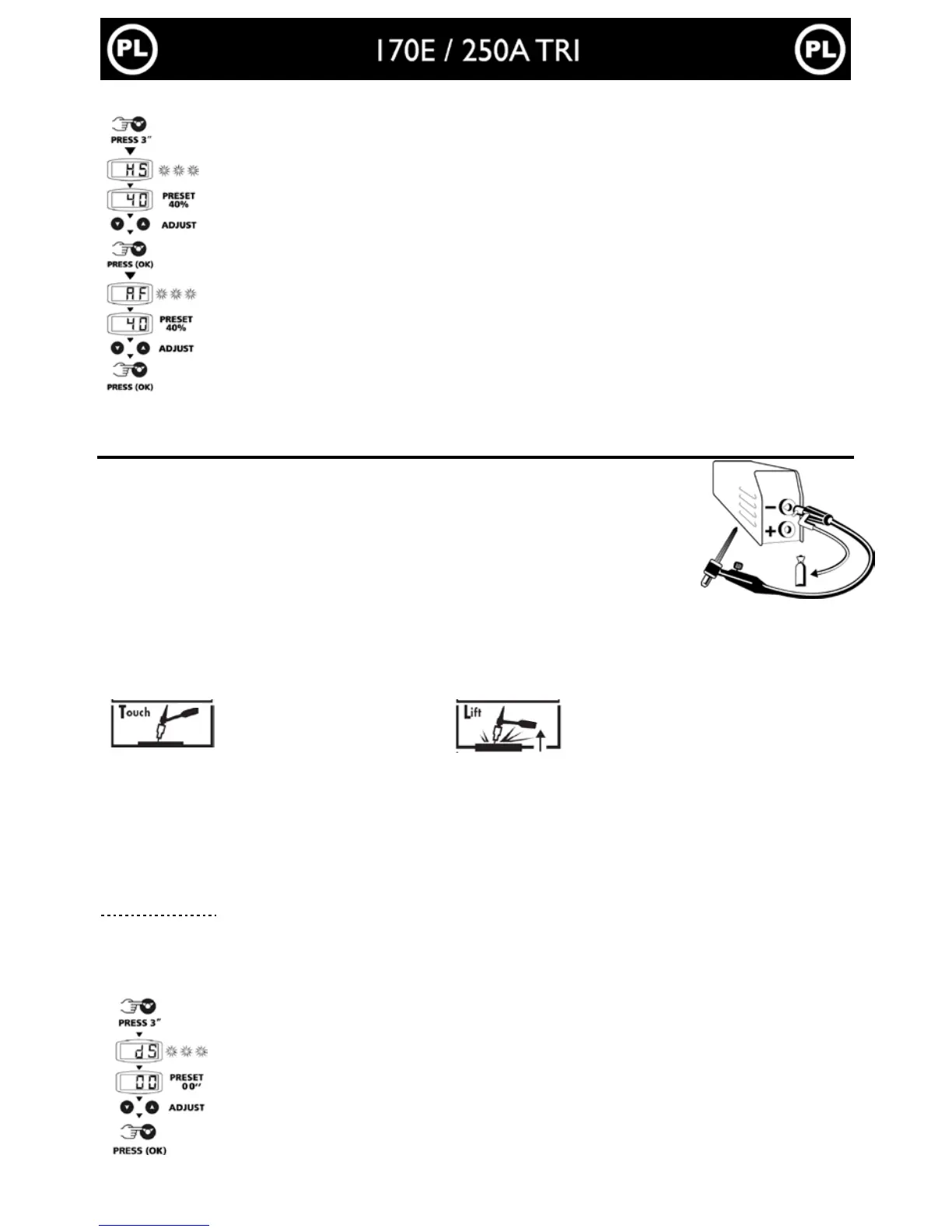 b) Dla 250A TRI: unieś i opuścić 2-krotnie palnik (góra-dół-góra-dół), aby zainicjować