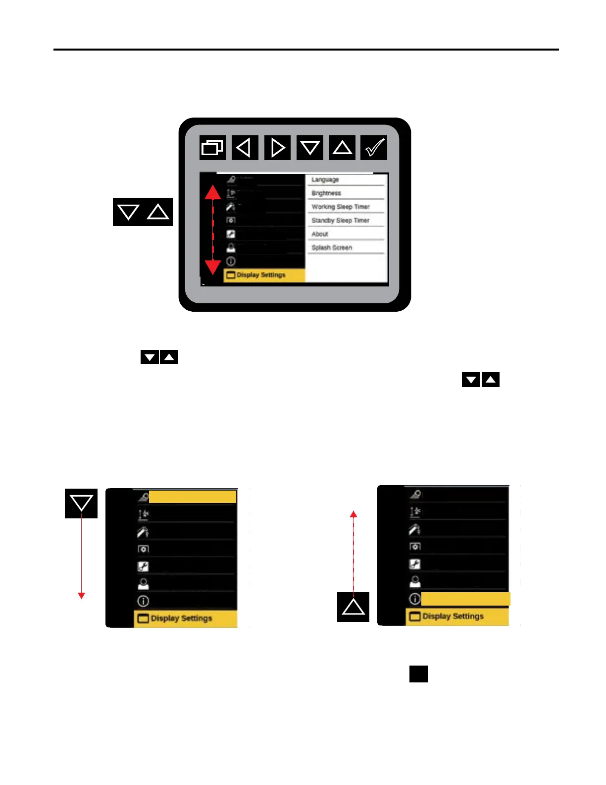 selection towards the bottom of the display settings, and the up arrow moves the selection towards the