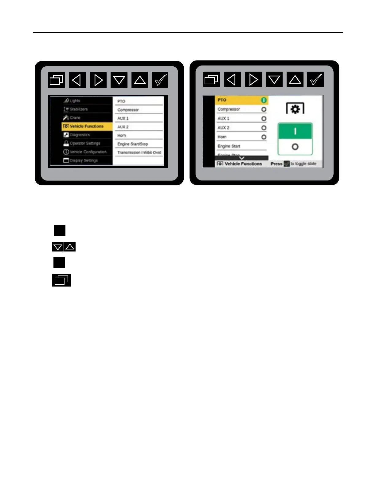 The Vehicle Functions menu will have menu options to turn on and turn o the PTO, Compres-