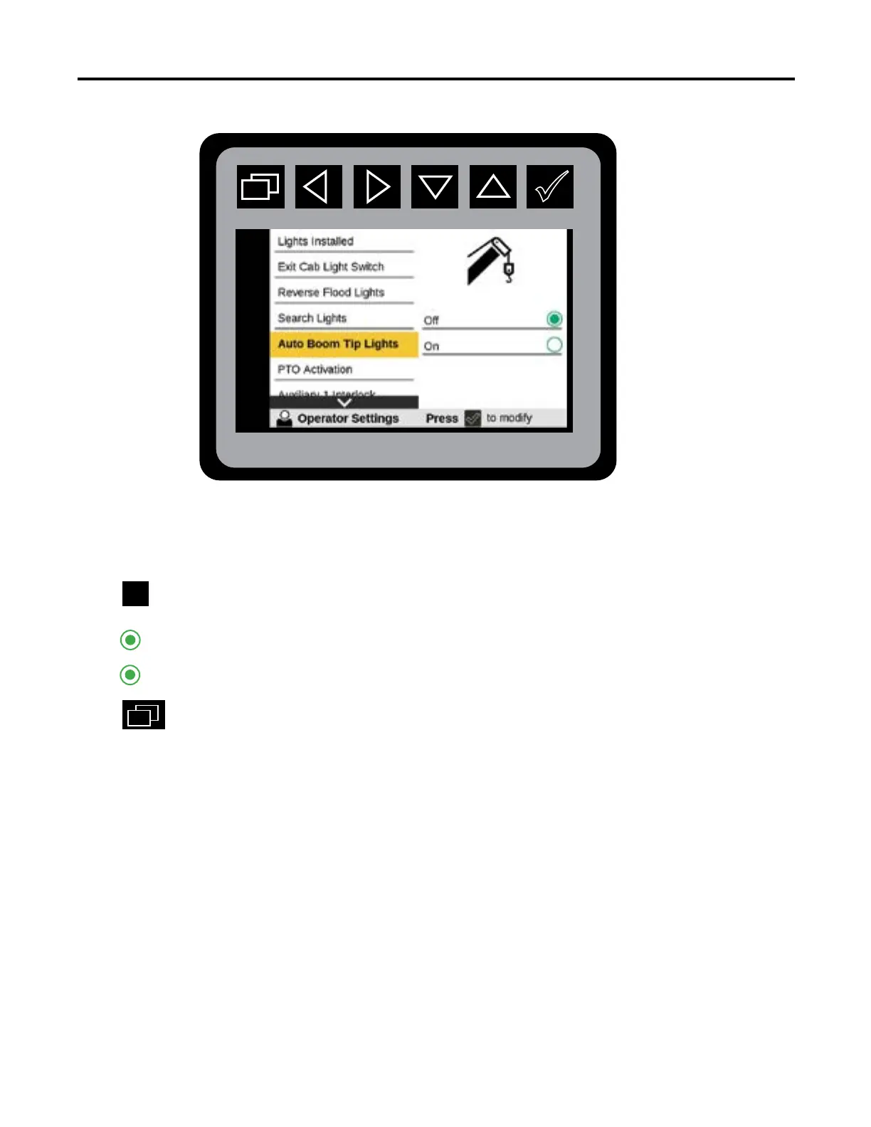 In order for Auto Boom Tip Lights to display on the navigation screen, Hydraulic Cranes must