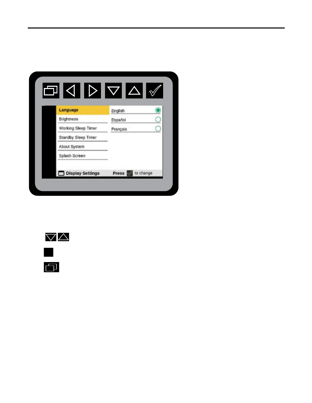 The Language Menu will allow selecting English, Spanish, and French. The default Language