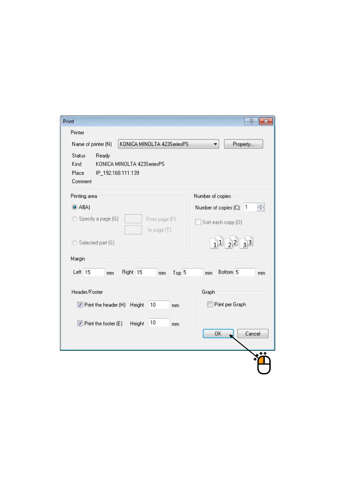 Select printer and input the setting of ‘Margin Setting’ and ‘Header/Footer’ and press [OK].
