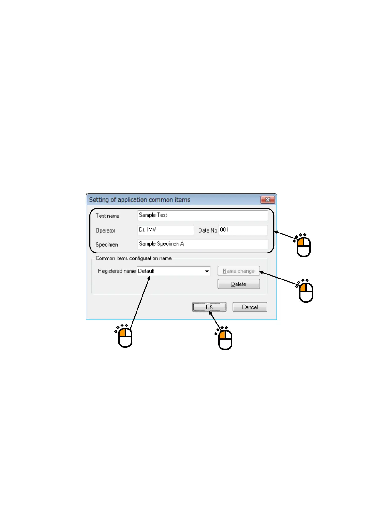 Specify a registration name of ‘Common Item set’ to register the set Common Output Item (②).