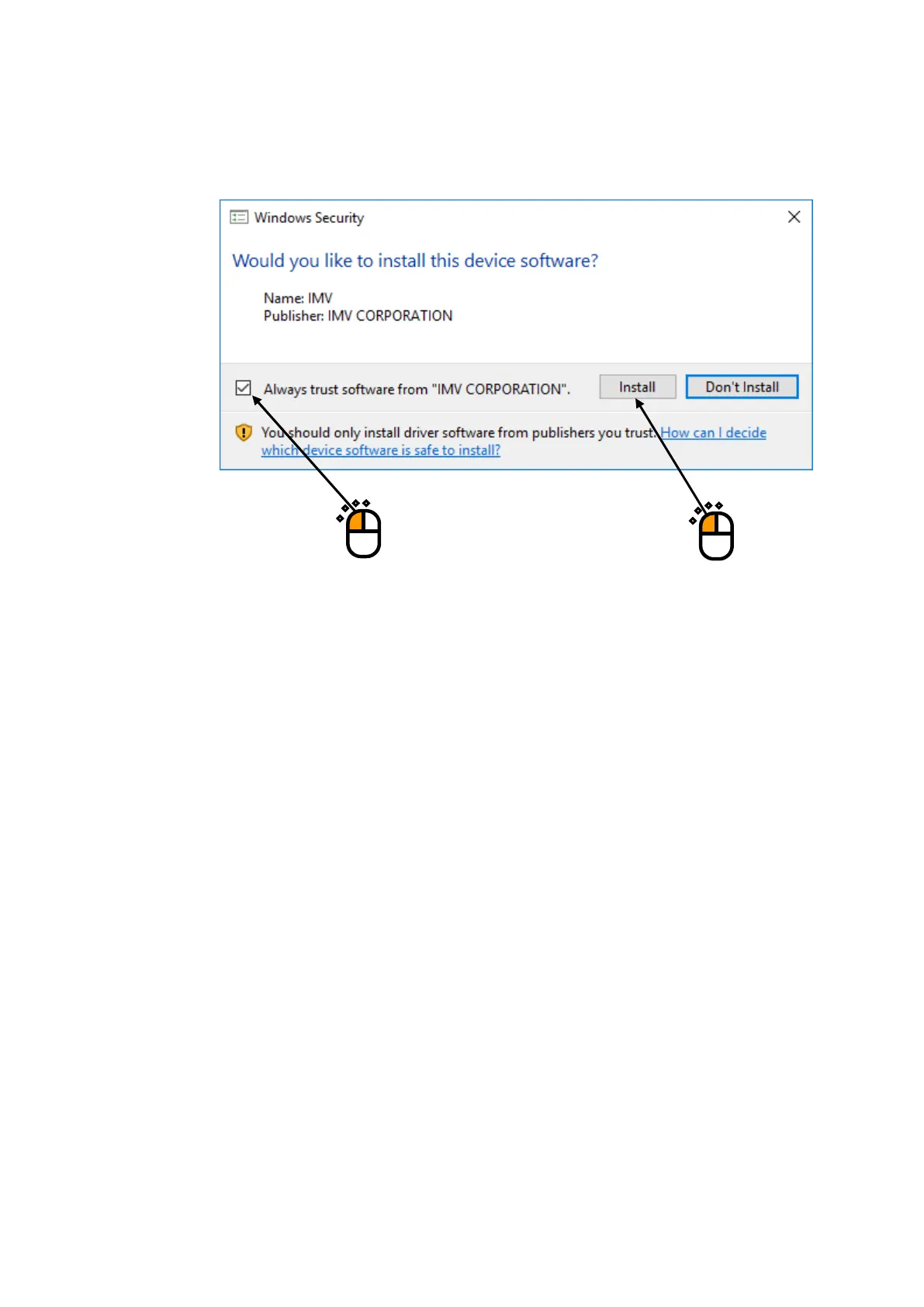 *) Unless the box of ‘Always trust software “IMV CORPORATION”.’ is checked, the screen