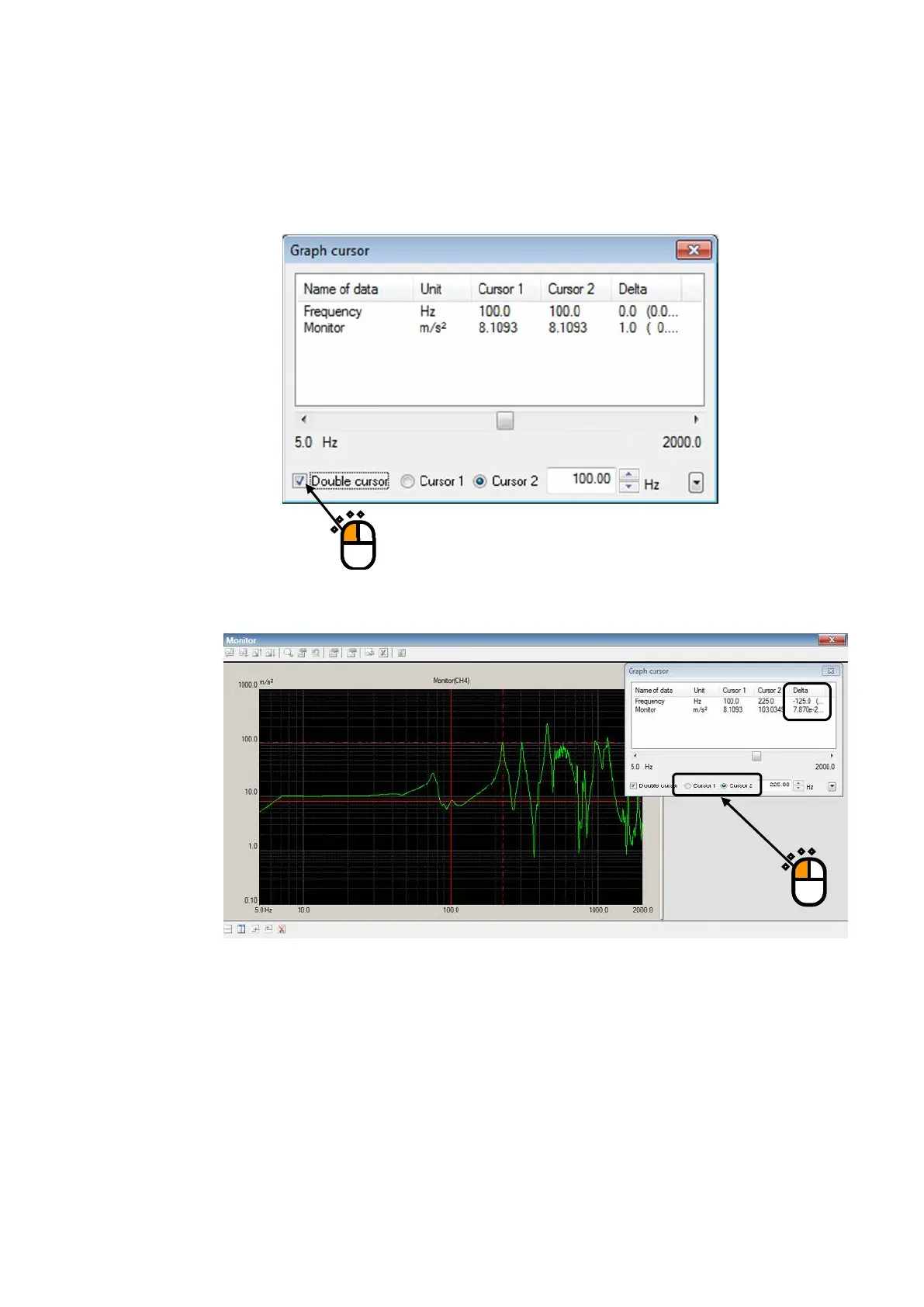 The graph cursor dialog box displays the difference between cursor 1 and cursor 2.
