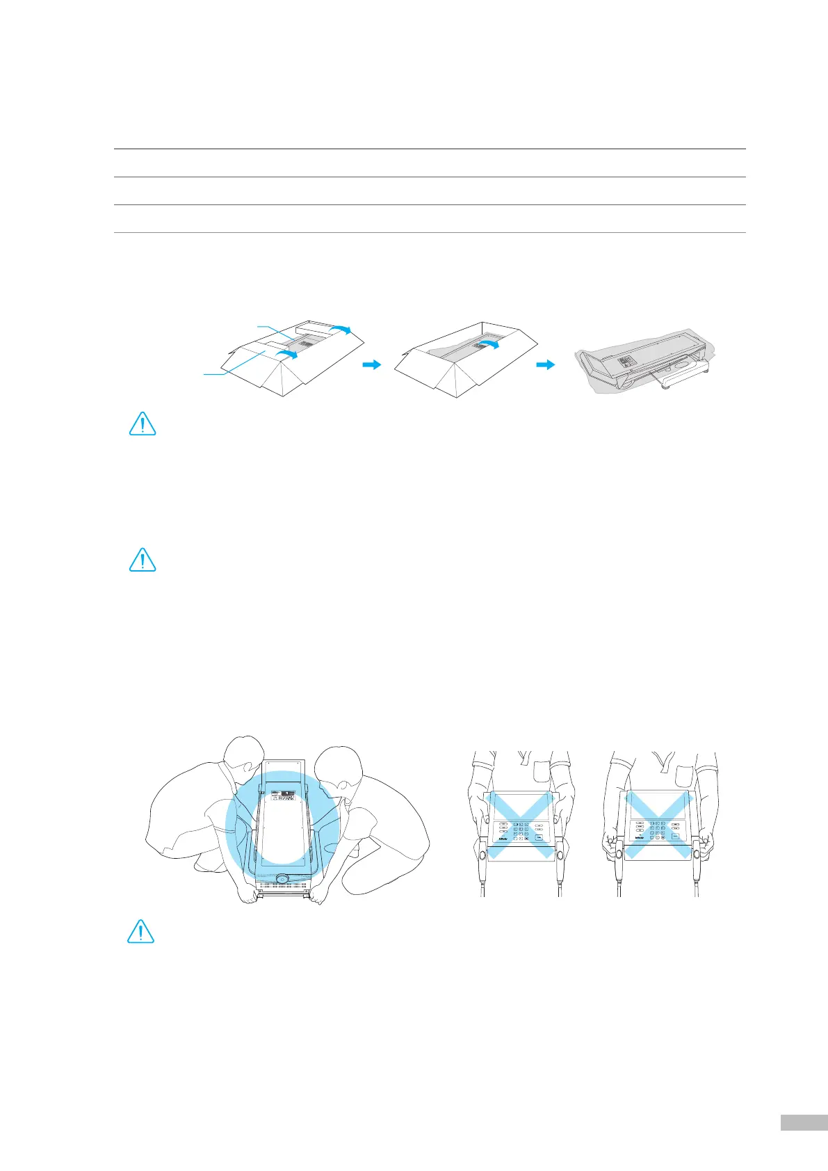 Please refer to the following illustrations to properly transport the equipment.