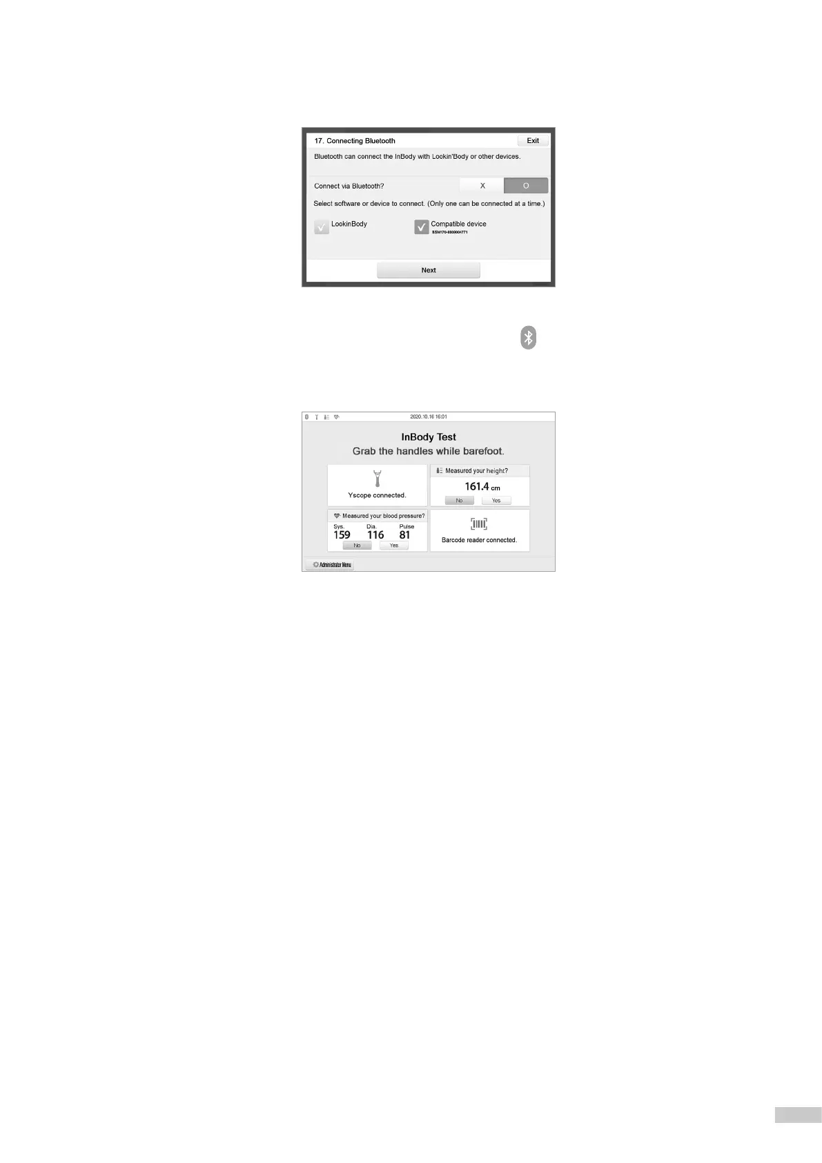 8) If the compatible device is paired properly, the Bluetooth ID of the device connected to the InBody970 will appear