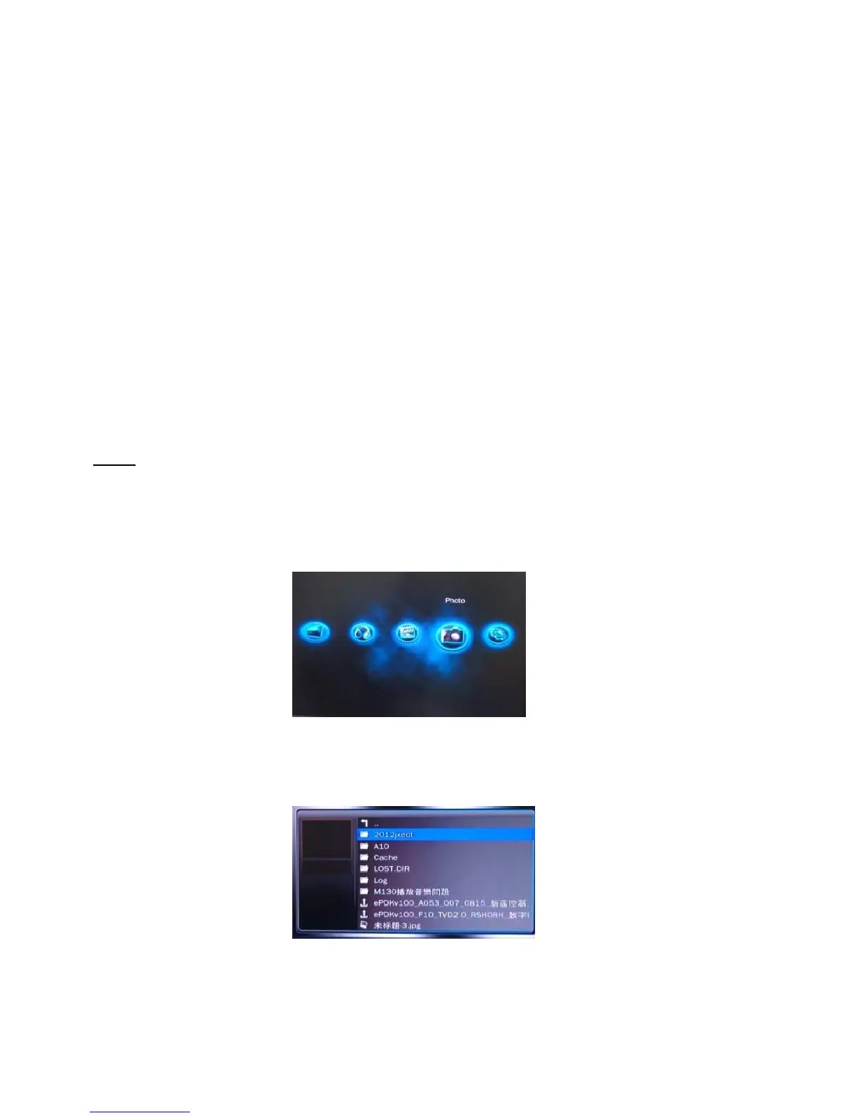 2. Use the left and right arrow keys on the remote to select the “Photo” icon on the main menu screen and click